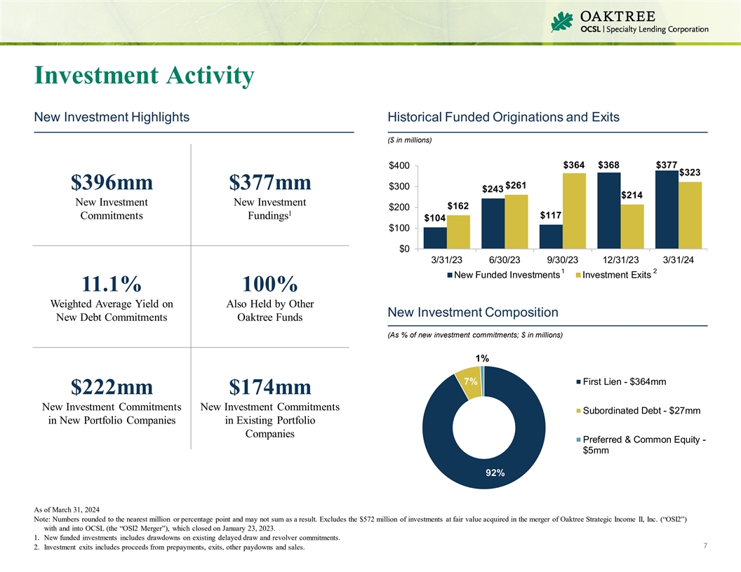 | | Originated $395.6 million of new investment commitments and received $322.6 million of proceeds from prepayments, exits, other paydowns and sales during the quarter ended March 31, 2024. The weighted average yield on new debt investments was 11.1%. |