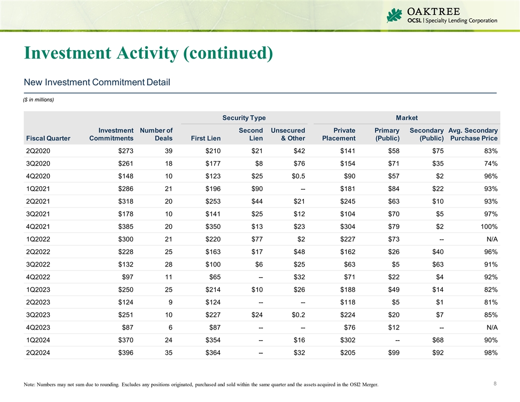 Investment Activity New Investment Highlights Historical Funded Originations and Exits ($ in millions) $364 $368 $377 $400 $323 $261 $396mm $377mm $300 $243 $214 New Investment New Investment $162 $200 1 $117 Commitments Fundings $104 $100 $0 3/31/23 6/30/23 9/30/23 12/31/23 3/31/24 1 2 New Funded Investments Investment Exits 11.1% 100% Weighted Average Yield on Also Held by Other New Investment Composition New Debt Commitments Oaktree Funds (As % of new investment commitments; $ in millions) 1% 7% First Lien - $364mm $222mm $174mm New Investment Commitments New Investment Commitments Subordinated Debt - $27mm in New Portfolio Companies in Existing Portfolio Companies Preferred & Common Equity - $5mm 92% As of March 31, 2024 Note: Numbers rounded to the nearest million or percentage point and may not sum as a result. Excludes the $572 million of investments at fair value acquired in the merger of Oaktree Strategic Income II, Inc. (“OSI2”) with and into OCSL (the “OSI2 Merger”), which closed on January 23, 2023. 1. New funded investments includes drawdowns on existing delayed draw and revolver commitments. 7 2. Investment exits includes proceeds from prepayments, exits, other paydowns and sales.