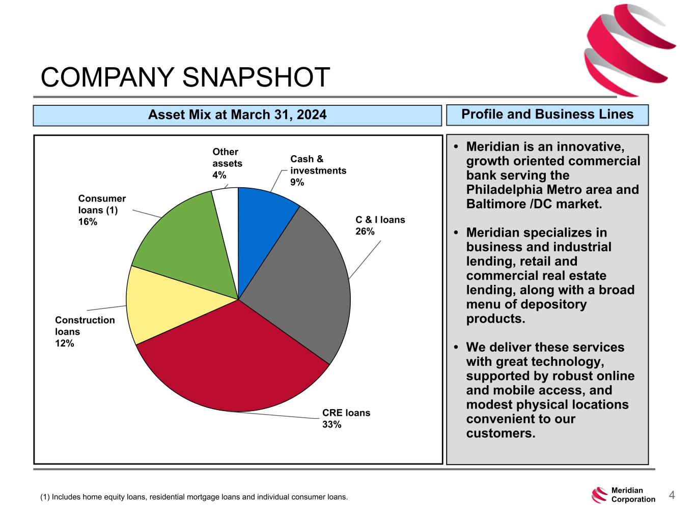 239 15 75 111 111 113 186 12 47 0 0 0 234 234 234 186 12 0 112 173 71 3Meridian Corporation GEOGRAPHIC FOOTPRINT Regional Market Full service branch Loan production office • Serves PA, NJ, DE & MD • Philadelphia MSA is 8th largest in the US • HQ in Malvern, PA • 6 full service branches • Main office in Wayne, PA • 8 mortgage loan production offices Satellite Commercial Loan Production Office • Naples, FL • Reaches broad SW FL market