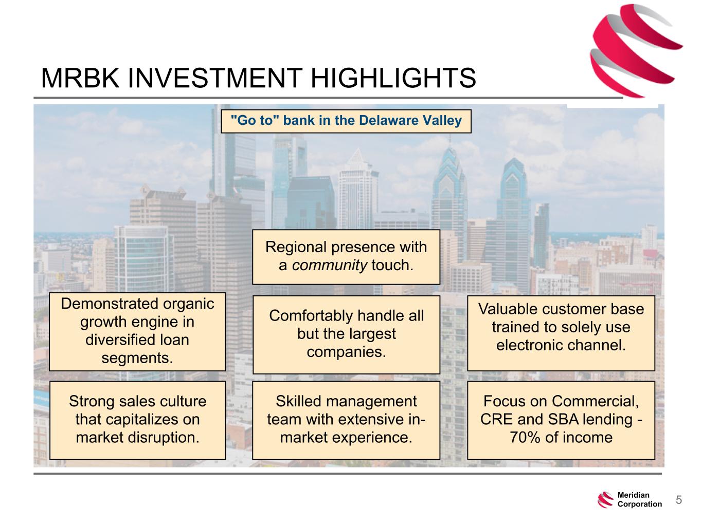 239 15 75 111 111 113 186 12 47 0 0 0 234 234 234 186 12 0 112 173 71 4Meridian Corporation COMPANY SNAPSHOT (1) Includes home equity loans, residential mortgage loans and individual consumer loans. • Meridian is an innovative, growth oriented commercial bank serving the Philadelphia Metro area and Baltimore /DC market. • Meridian specializes in business and industrial lending, retail and commercial real estate lending, along with a broad menu of depository products. • We deliver these services with great technology, supported by robust online and mobile access, and modest physical locations convenient to our customers. Cash & investments 9% C & I loans 26% CRE loans 33% Construction loans 12% Consumer loans (1) 16% Other assets 4% Asset Mix at March 31, 2024 Profile and Business Lines