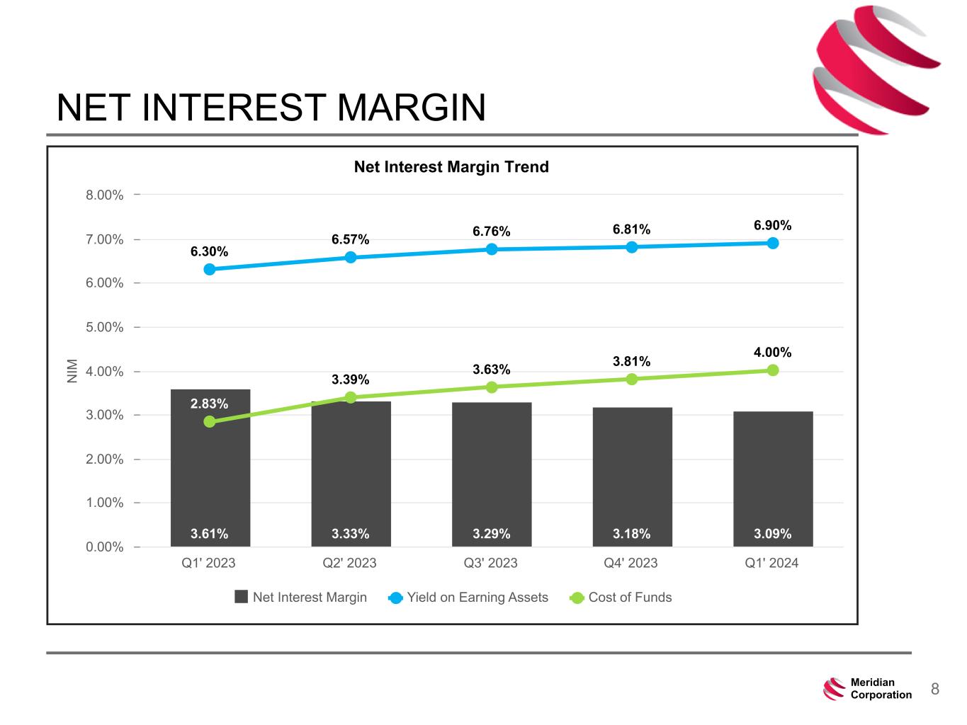 239 15 75 111 111 113 186 12 47 0 0 0 234 234 234 186 12 0 112 173 71 8Meridian Corporation NET INTEREST MARGIN N IM Net Interest Margin Trend 3.61% 3.33% 3.29% 3.18% 3.09% 6.30% 6.57% 6.76% 6.81% 6.90% 2.83% 3.39% 3.63% 3.81% 4.00% Net Interest Margin Yield on Earning Assets Cost of Funds Q1' 2023 Q2' 2023 Q3' 2023 Q4' 2023 Q1' 2024 0.00% 1.00% 2.00% 3.00% 4.00% 5.00% 6.00% 7.00% 8.00%
