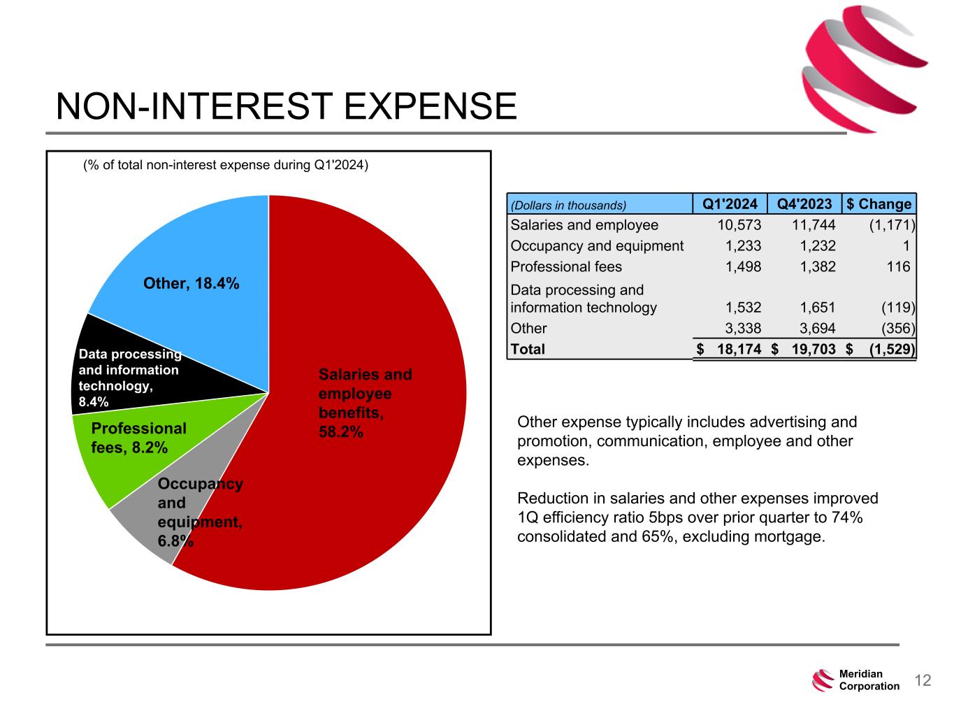 239 15 75 111 111 113 186 12 47 0 0 0 234 234 234 186 12 0 112 173 71 12Meridian Corporation NON-INTEREST EXPENSE (% of total non-interest expense during Q1'2024) (Dollars in thousands) Q1'2024 Q4'2023 $ Change Salaries and employee 10,573 11,744 (1,171) Occupancy and equipment 1,233 1,232 1 Professional fees 1,498 1,382 116 Data processing and information technology 1,532 1,651 (119) Other 3,338 3,694 (356) Total $ 18,174 $ 19,703 $ (1,529) Salaries and employee benefits, 58.2% Occupancy and equipment, 6.8% Professional fees, 8.2% Data processing and information technology, 8.4% Other, 18.4% Other expense typically includes advertising and promotion, communication, employee and other expenses. Reduction in salaries and other expenses improved 1Q efficiency ratio 5bps over prior quarter to 74% consolidated and 65%, excluding mortgage.