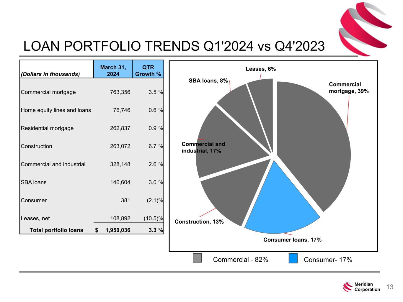 239 15 75 111 111 113 186 12 47 0 0 0 234 234 234 186 12 0 112 173 71 11Meridian Corporation MORTGAGE VOLUME & MARGIN TRENDS • Margin: Q1'24 margin of 2.95% up 19 bps from 2.76% for the prior quarter. • Volume continues to be impacted by lack of home inventory, higher mortgage rates, and high property values. 2Q'22 3Q'22 4Q'22 1Q'23 2Q'23 3Q'23 4Q'23 1Q'24 Refinance (%) 14.87 % 13.69 % 11.31 % 12.62 % 9.06 % 9.70 % 13.12 % 15.59 % Purchase (%) 85.13 % 86.31 % 87.60 % 87.44 % 90.94 % 90.30 % 86.88 % 84.41 % Lo an S al e M ar gi n %
