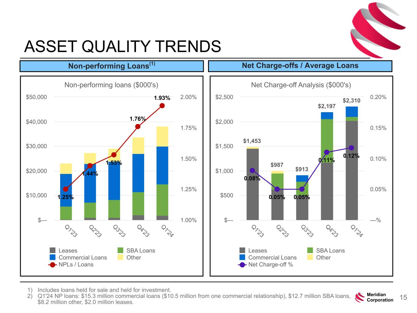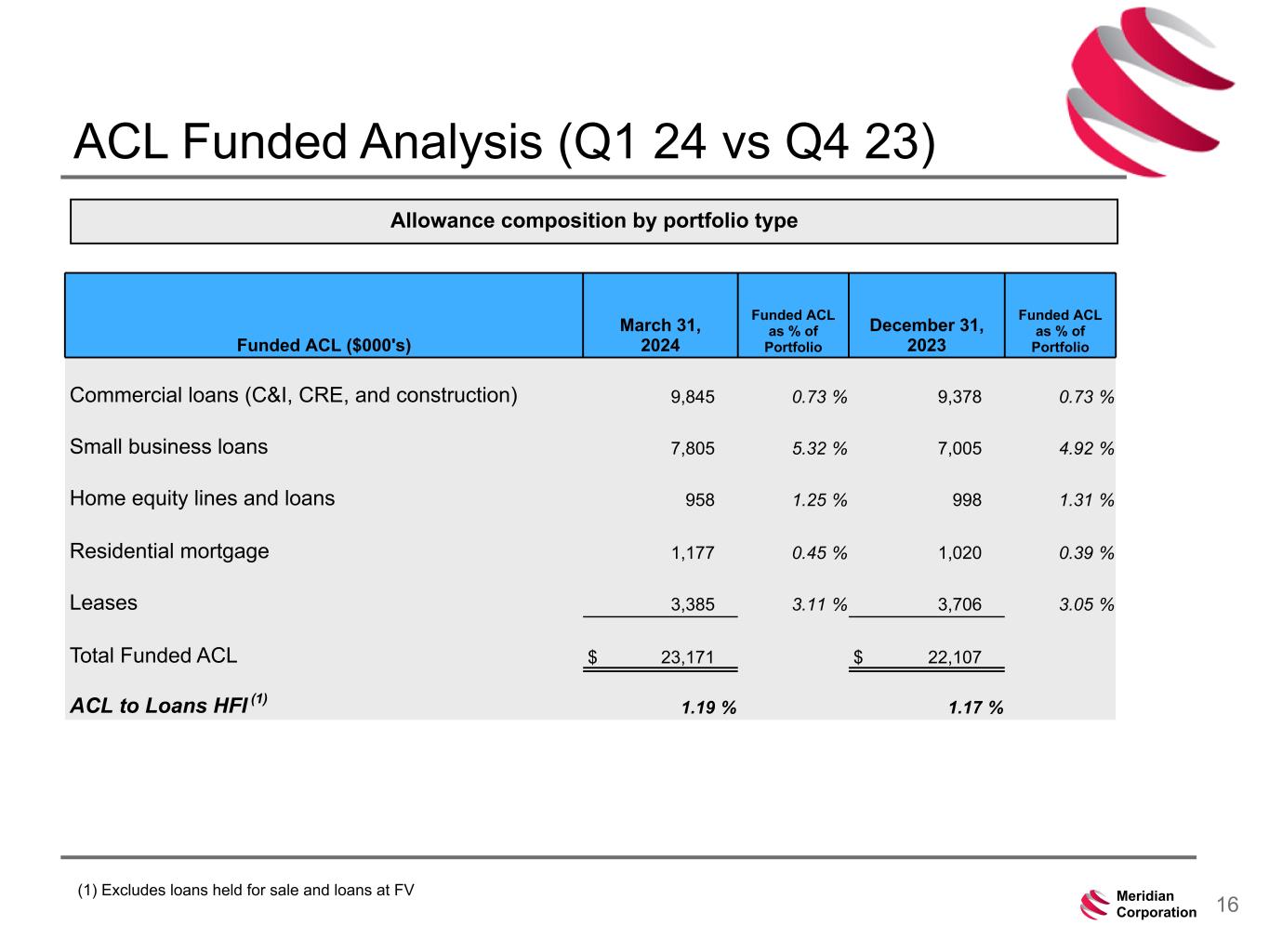 239 15 75 111 111 113 186 12 47 0 0 0 234 234 234 186 12 0 112 173 71 15Meridian Corporation ASSET QUALITY TRENDS 1) Includes loans held for sale and held for investment. 2) Q1'24 NP loans: $15.3 million commercial loans ($10.5 million from one commercial relationship), $12.7 million SBA loans, $8.2 million other, $2.0 million leases. Non-performing Loans(1) Net Charge-offs / Average Loans Net Charge-off Analysis ($000's) $1,453 $987 $913 $2,197 $2,310 0.08% 0.05% 0.05% 0.11% 0.12% Leases SBA Loans Commercial Loans Other Net Charge-off % Q1'23 Q2'23 Q3'23 Q4'23 Q1'24 $— $500 $1,000 $1,500 $2,000 $2,500 —% 0.05% 0.10% 0.15% 0.20%$10.5 million relate to one relationship Non-performing loans ($000's) 1.25% 1.44% 1.53% 1.76% 1.93% Leases SBA Loans Commercial Loans Other NPLs / Loans Q1'23 Q2'23 Q3'23 Q4'23 Q1'24 $— $10,000 $20,000 $30,000 $40,000 $50,000 1.00% 1.25% 1.50% 1.75% 2.00%