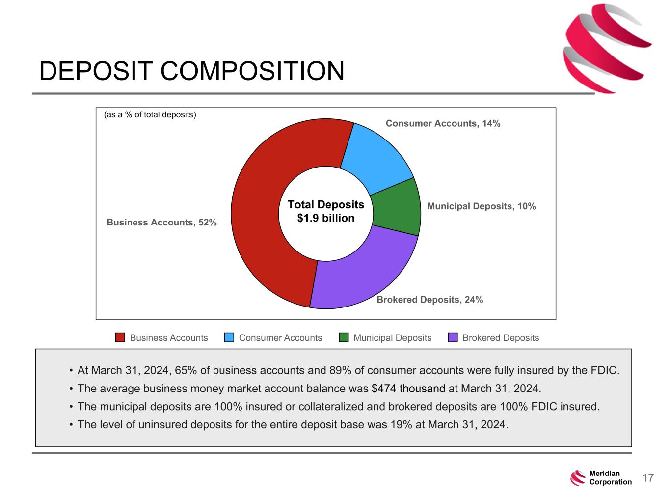 239 15 75 111 111 113 186 12 47 0 0 0 234 234 234 186 12 0 112 173 71 17Meridian Corporation DEPOSIT COMPOSITION Business Accounts, 52% Consumer Accounts, 14% Municipal Deposits, 10% Brokered Deposits, 24% Business Accounts Consumer Accounts Municipal Deposits Brokered Deposits Total Deposits $1.9 billion • At March 31, 2024, 65% of business accounts and 89% of consumer accounts were fully insured by the FDIC. • The average business money market account balance was $474 thousand at March 31, 2024. • The municipal deposits are 100% insured or collateralized and brokered deposits are 100% FDIC insured. • The level of uninsured deposits for the entire deposit base was 19% at March 31, 2024. (as a % of total deposits)