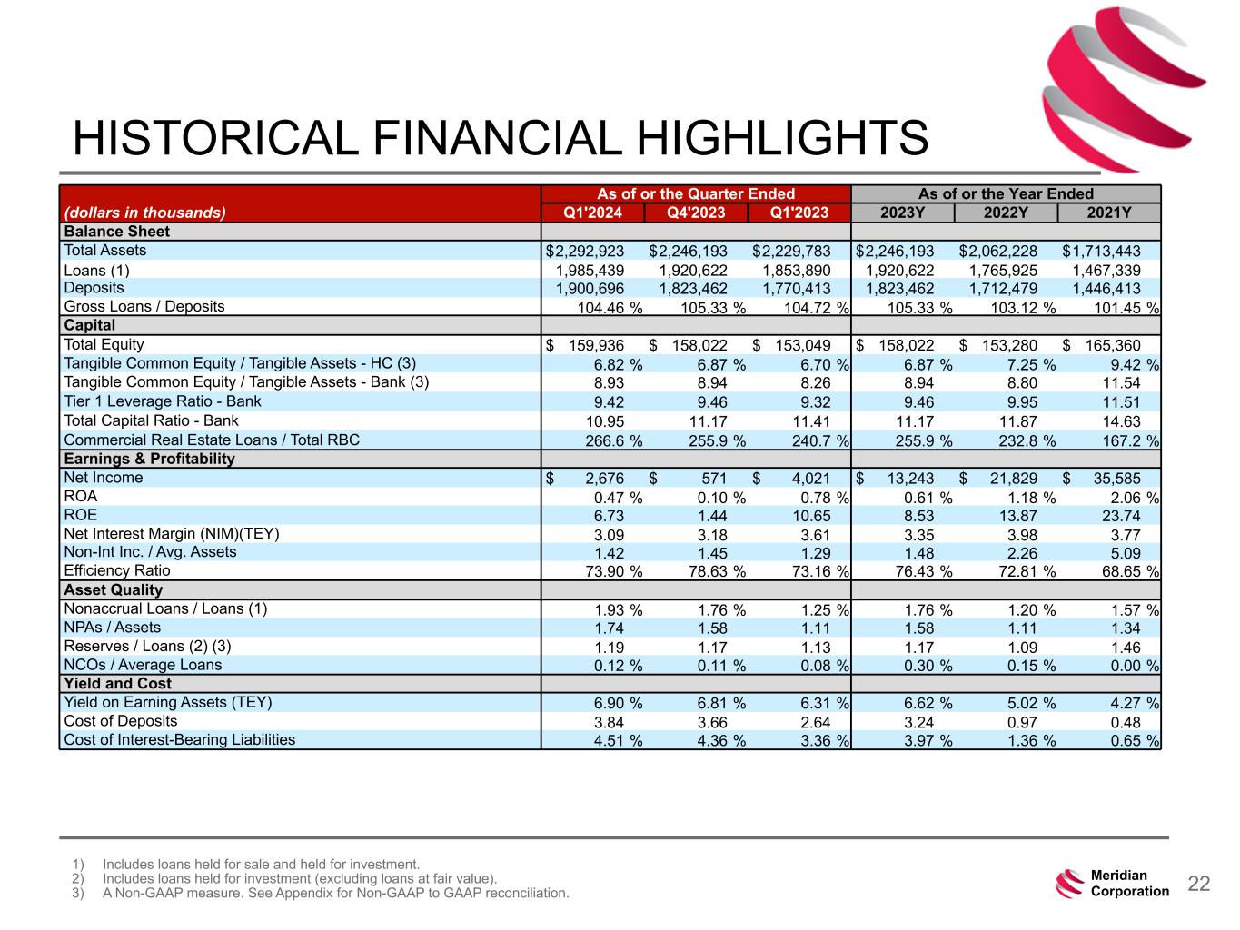 239 15 75 111 111 113 186 12 47 0 0 0 234 234 234 186 12 0 112 173 71 22Meridian Corporation HISTORICAL FINANCIAL HIGHLIGHTS 1) Includes loans held for sale and held for investment. 2) Includes loans held for investment (excluding loans at fair value). 3) A Non-GAAP measure. See Appendix for Non-GAAP to GAAP reconciliation. As of or the Quarter Ended As of or the Year Ended (dollars in thousands) Q1'2024 Q4'2023 Q1'2023 2023Y 2022Y 2021Y Balance Sheet Total Assets $ 2,292,923 $ 2,246,193 $ 2,229,783 $ 2,246,193 $ 2,062,228 $ 1,713,443 Loans (1) 1,985,439 1,920,622 1,853,890 1,920,622 1,765,925 1,467,339 Deposits 1,900,696 1,823,462 1,770,413 1,823,462 1,712,479 1,446,413 Gross Loans / Deposits 104.46 % 105.33 % 104.72 % 105.33 % 103.12 % 101.45 % Capital Total Equity $ 159,936 $ 158,022 $ 153,049 $ 158,022 $ 153,280 $ 165,360 Tangible Common Equity / Tangible Assets - HC (3) 6.82 % 6.87 % 6.70 % 6.87 % 7.25 % 9.42 % Tangible Common Equity / Tangible Assets - Bank (3) 8.93 8.94 8.26 8.94 8.80 11.54 Tier 1 Leverage Ratio - Bank 9.42 9.46 9.32 9.46 9.95 11.51 Total Capital Ratio - Bank 10.95 11.17 11.41 11.17 11.87 14.63 Commercial Real Estate Loans / Total RBC 266.6 % 255.9 % 240.7 % 255.9 % 232.8 % 167.2 % Earnings & Profitability Net Income $ 2,676 $ 571 $ 4,021 $ 13,243 $ 21,829 $ 35,585 ROA 0.47 % 0.10 % 0.78 % 0.61 % 1.18 % 2.06 % ROE 6.73 1.44 10.65 8.53 13.87 23.74 Net Interest Margin (NIM)(TEY) 3.09 3.18 3.61 3.35 3.98 3.77 Non-Int Inc. / Avg. Assets 1.42 1.45 1.29 1.48 2.26 5.09 Efficiency Ratio 73.90 % 78.63 % 73.16 % 76.43 % 72.81 % 68.65 % Asset Quality Nonaccrual Loans / Loans (1) 1.93 % 1.76 % 1.25 % 1.76 % 1.20 % 1.57 % NPAs / Assets 1.74 1.58 1.11 1.58 1.11 1.34 Reserves / Loans (2) (3) 1.19 1.17 1.13 1.17 1.09 1.46 NCOs / Average Loans 0.12 % 0.11 % 0.08 % 0.30 % 0.15 % 0.00 % Yield and Cost Yield on Earning Assets (TEY) 6.90 % 6.81 % 6.31 % 6.62 % 5.02 % 4.27 % Cost of Deposits 3.84 3.66 2.64 3.24 0.97 0.48 Cost of Interest-Bearing Liabilities 4.51 % 4.36 % 3.36 % 3.97 % 1.36 % 0.65 %
