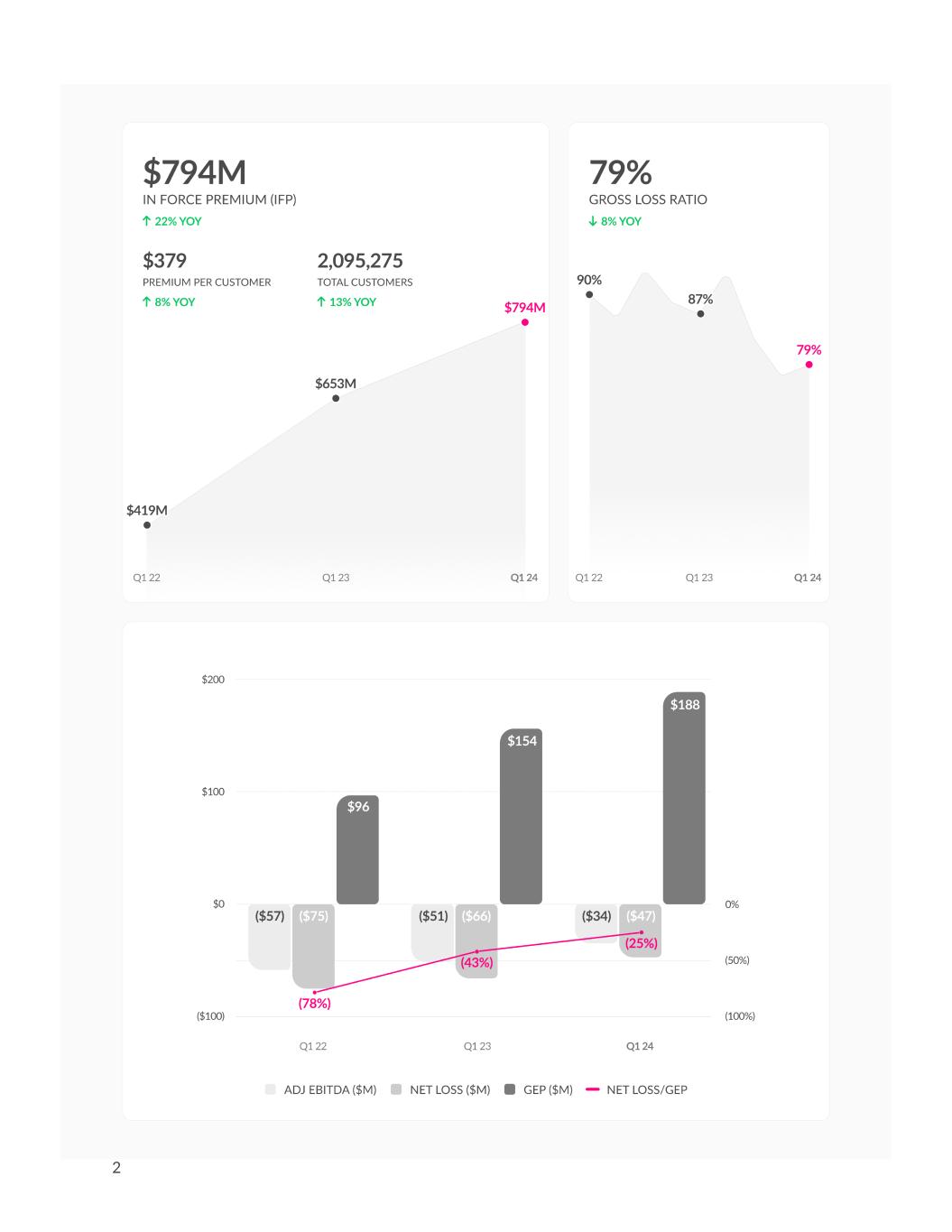 Dear Shareholders, Our first quarter results were excellent, and we’re pleased to note that we now expect cash flow breakeven by year-end 2024. Here’s a quick look at our operating metrics for Q1: • Top line: At $794 million, in-force premium (IFP) grew 22% year on year, while total revenue grew 25%. • Loss Ratio: At 79%, gross loss ratio showed an 8 point year on year improvement. • Gross Profit: Climbed 110% year on year, while Gross Profit Margin improved by 12 points to 29%. • Operating Expense: Increased just 2% year on year. • Bottom line: At ($34) million, Adjusted EBITDA loss improved 33% year on year, while Net Loss at ($47) million, improved 28%. 3