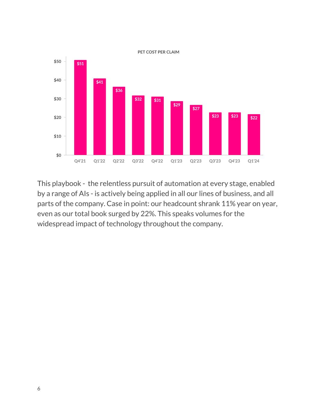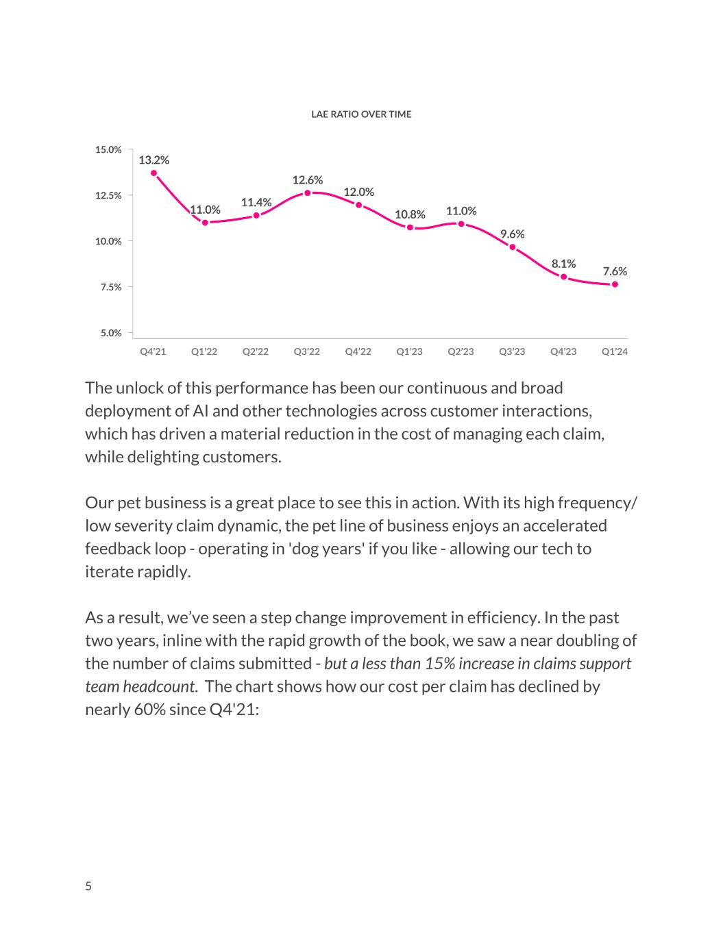 The unlock of this performance has been our continuous and broad deployment of AI and other technologies across customer interactions, which has driven a material reduction in the cost of managing each claim, while delighting customers. Our pet business is a great place to see this in action. With its high frequency/ low severity claim dynamic, the pet line of business enjoys an accelerated feedback loop - operating in 'dog years' if you like - allowing our tech to iterate rapidly. As a result, we’ve seen a step change improvement in efficiency. In the past two years, inline with the rapid growth of the book, we saw a near doubling of the number of claims submitted - but a less than 15% increase in claims support team headcount. The chart shows how our cost per claim has declined by nearly 60% since Q4'21: 5