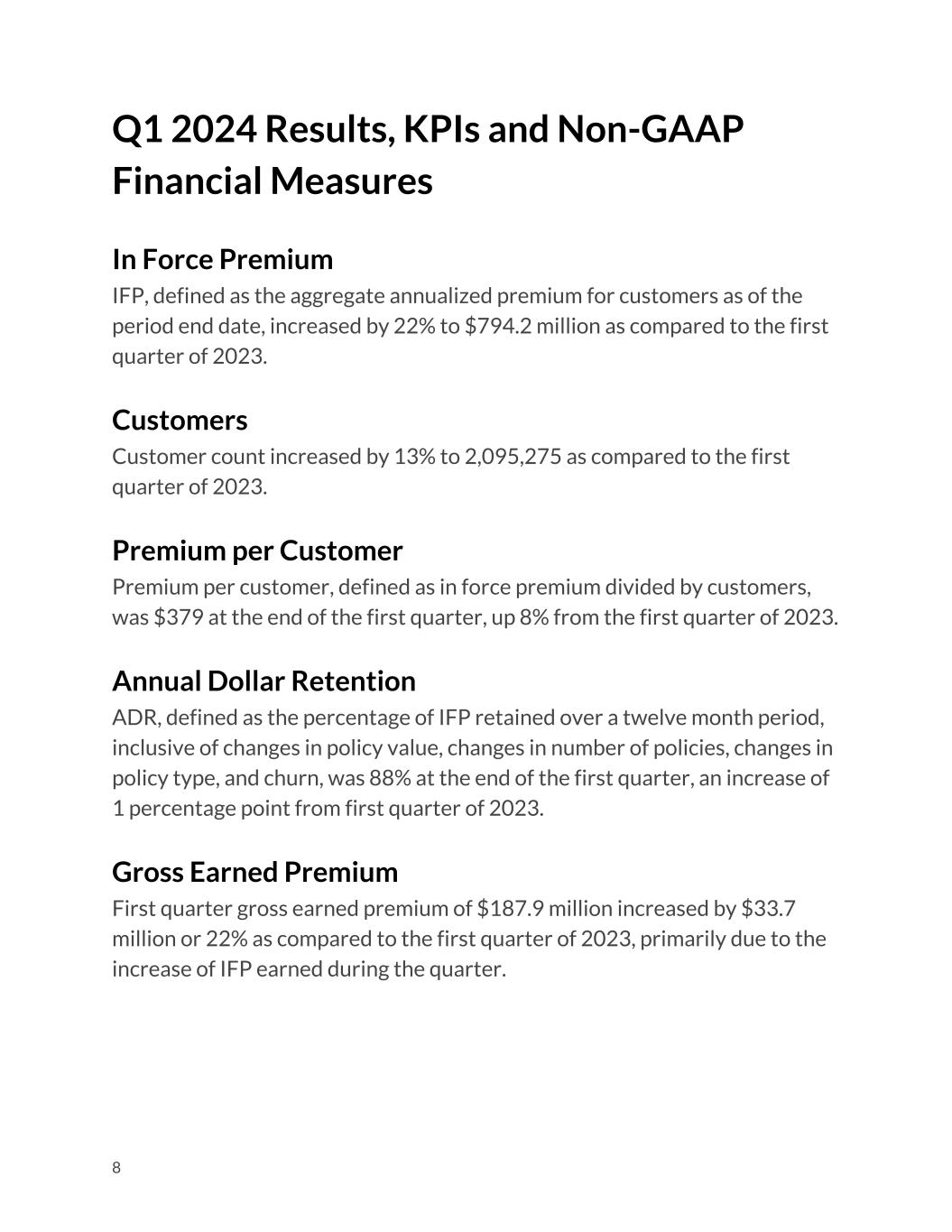 Q1 2024 Results, KPIs and Non-GAAP Financial Measures In Force Premium IFP, defined as the aggregate annualized premium for customers as of the period end date, increased by 22% to $794.2 million as compared to the first quarter of 2023. Customers Customer count increased by 13% to 2,095,275 as compared to the first quarter of 2023. Premium per Customer Premium per customer, defined as in force premium divided by customers, was $379 at the end of the first quarter, up 8% from the first quarter of 2023. Annual Dollar Retention ADR, defined as the percentage of IFP retained over a twelve month period, inclusive of changes in policy value, changes in number of policies, changes in policy type, and churn, was 88% at the end of the first quarter, an increase of 1 percentage point from first quarter of 2023. Gross Earned Premium First quarter gross earned premium of $187.9 million increased by $33.7 million or 22% as compared to the first quarter of 2023, primarily due to the increase of IFP earned during the quarter. 8