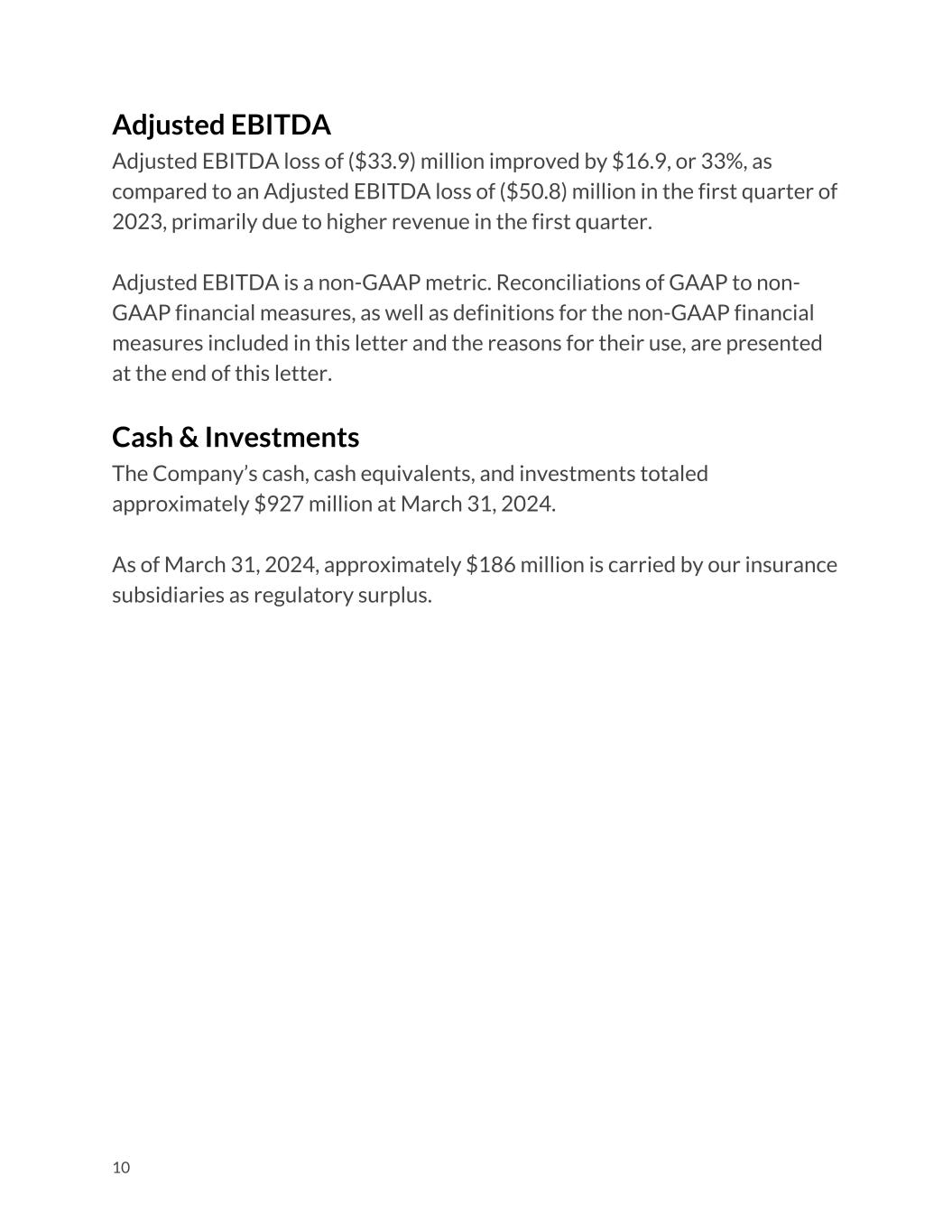 Adjusted EBITDA Adjusted EBITDA loss of ($33.9) million improved by $16.9, or 33%, as compared to an Adjusted EBITDA loss of ($50.8) million in the first quarter of 2023, primarily due to higher revenue in the first quarter. Adjusted EBITDA is a non-GAAP metric. Reconciliations of GAAP to non- GAAP financial measures, as well as definitions for the non-GAAP financial measures included in this letter and the reasons for their use, are presented at the end of this letter. Cash & Investments The Company’s cash, cash equivalents, and investments totaled approximately $927 million at March 31, 2024. As of March 31, 2024, approximately $186 million is carried by our insurance subsidiaries as regulatory surplus. 10