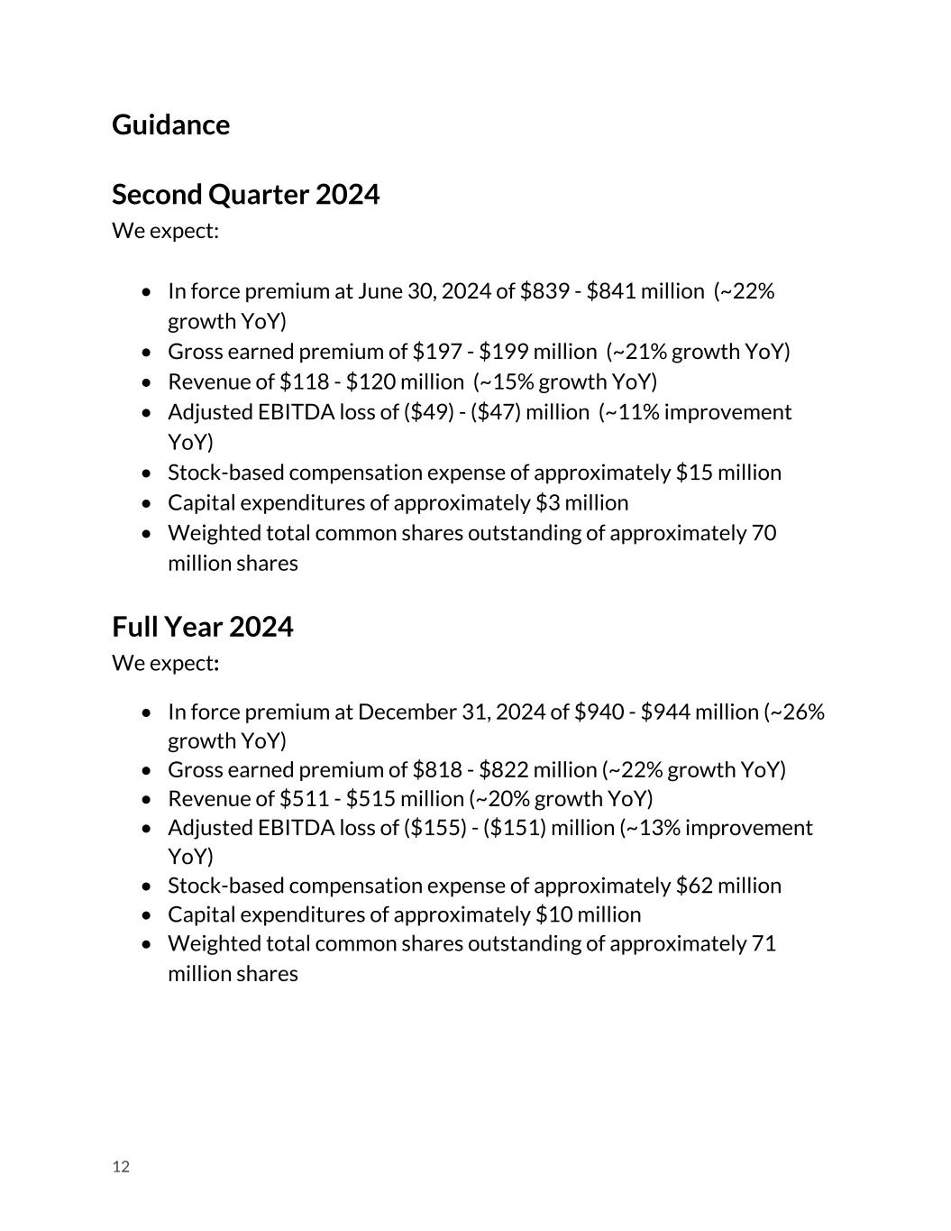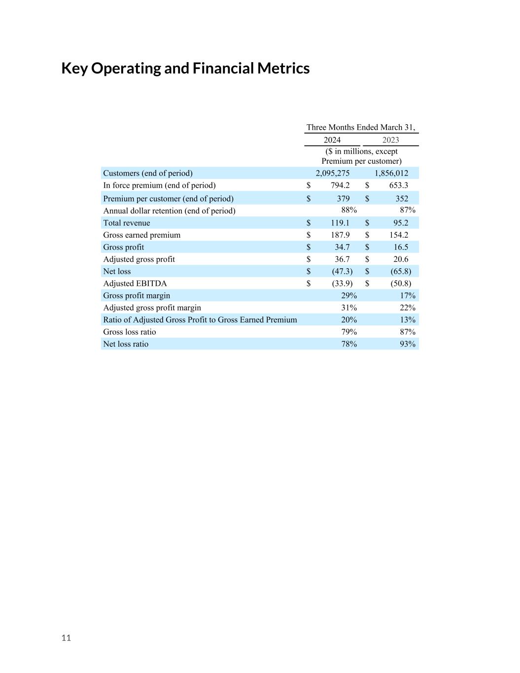 Key Operating and Financial Metrics Three Months Ended March 31, 2024 2023 ($ in millions, except Premium per customer) Customers (end of period) 2,095,275 1,856,012 In force premium (end of period) $ 794.2 $ 653.3 Premium per customer (end of period) $ 379 $ 352 Annual dollar retention (end of period) 88% 87% Total revenue $ 119.1 $ 95.2 Gross earned premium $ 187.9 $ 154.2 Gross profit $ 34.7 $ 16.5 Adjusted gross profit $ 36.7 $ 20.6 Net loss $ (47.3) $ (65.8) Adjusted EBITDA $ (33.9) $ (50.8) Gross profit margin 29% 17% Adjusted gross profit margin 31% 22% Ratio of Adjusted Gross Profit to Gross Earned Premium 20% 13% Gross loss ratio 79% 87% Net loss ratio 78% 93% 11