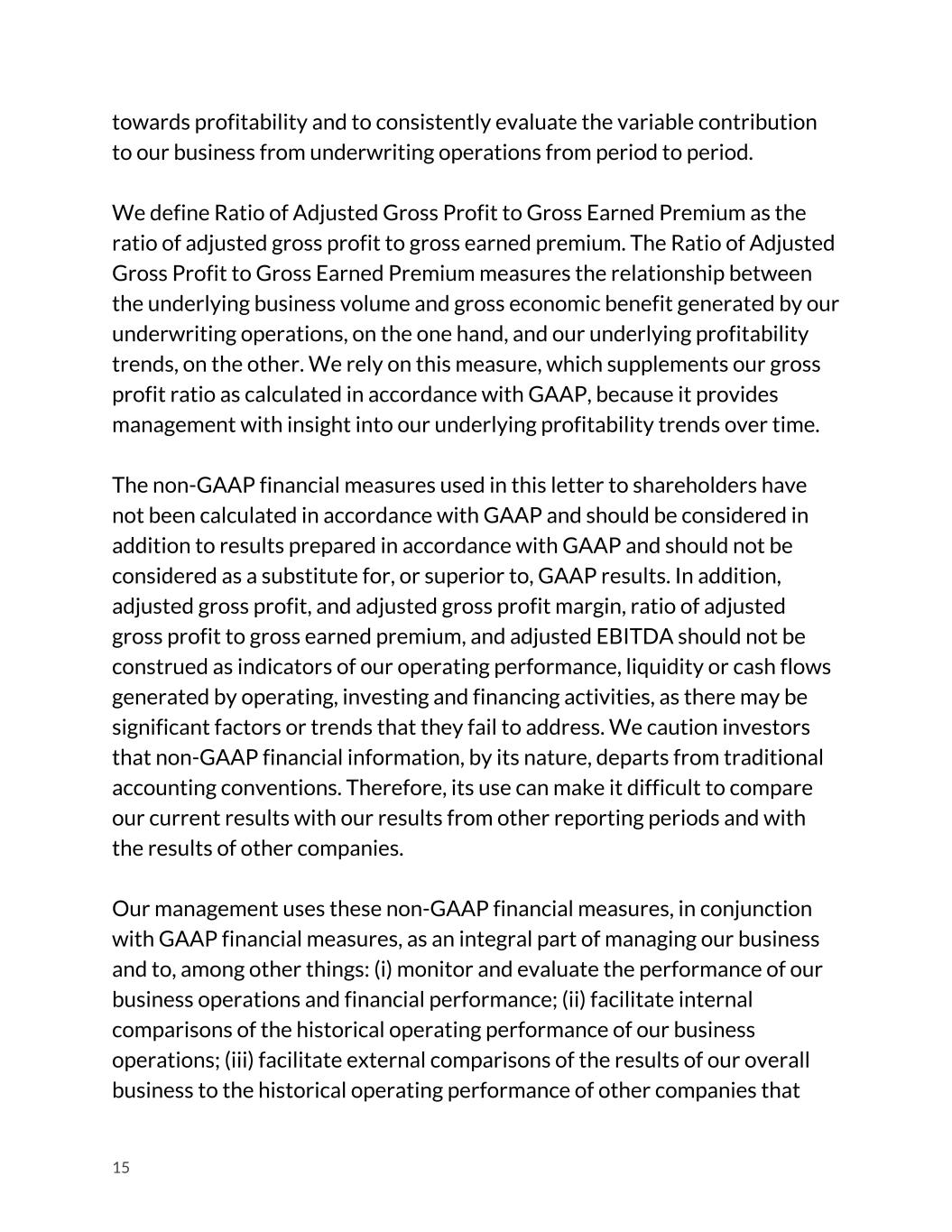 towards profitability and to consistently evaluate the variable contribution to our business from underwriting operations from period to period. We define Ratio of Adjusted Gross Profit to Gross Earned Premium as the ratio of adjusted gross profit to gross earned premium. The Ratio of Adjusted Gross Profit to Gross Earned Premium measures the relationship between the underlying business volume and gross economic benefit generated by our underwriting operations, on the one hand, and our underlying profitability trends, on the other. We rely on this measure, which supplements our gross profit ratio as calculated in accordance with GAAP, because it provides management with insight into our underlying profitability trends over time. The non-GAAP financial measures used in this letter to shareholders have not been calculated in accordance with GAAP and should be considered in addition to results prepared in accordance with GAAP and should not be considered as a substitute for, or superior to, GAAP results. In addition, adjusted gross profit, and adjusted gross profit margin, ratio of adjusted gross profit to gross earned premium, and adjusted EBITDA should not be construed as indicators of our operating performance, liquidity or cash flows generated by operating, investing and financing activities, as there may be significant factors or trends that they fail to address. We caution investors that non-GAAP financial information, by its nature, departs from traditional accounting conventions. Therefore, its use can make it difficult to compare our current results with our results from other reporting periods and with the results of other companies. Our management uses these non-GAAP financial measures, in conjunction with GAAP financial measures, as an integral part of managing our business and to, among other things: (i) monitor and evaluate the performance of our business operations and financial performance; (ii) facilitate internal comparisons of the historical operating performance of our business operations; (iii) facilitate external comparisons of the results of our overall business to the historical operating performance of other companies that 15