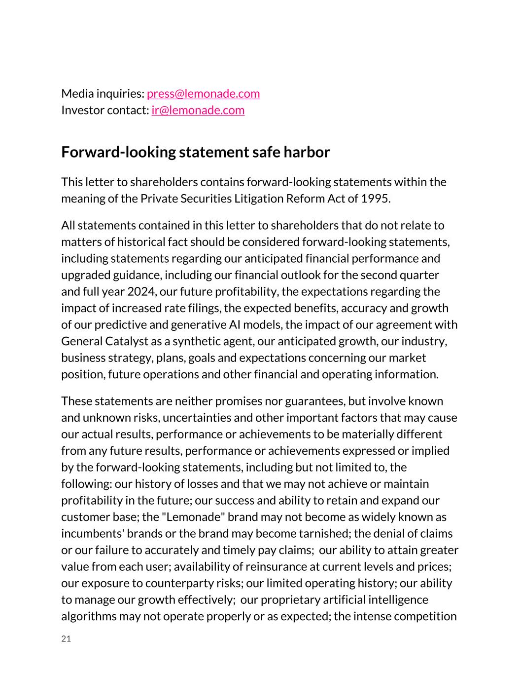 Media inquiries: press@lemonade.com Investor contact: ir@lemonade.com Forward-looking statement safe harbor This letter to shareholders contains forward-looking statements within the meaning of the Private Securities Litigation Reform Act of 1995. All statements contained in this letter to shareholders that do not relate to matters of historical fact should be considered forward-looking statements, including statements regarding our anticipated financial performance and upgraded guidance, including our financial outlook for the second quarter and full year 2024, our future profitability, the expectations regarding the impact of increased rate filings, the expected benefits, accuracy and growth of our predictive and generative AI models, the impact of our agreement with General Catalyst as a synthetic agent, our anticipated growth, our industry, business strategy, plans, goals and expectations concerning our market position, future operations and other financial and operating information. These statements are neither promises nor guarantees, but involve known and unknown risks, uncertainties and other important factors that may cause our actual results, performance or achievements to be materially different from any future results, performance or achievements expressed or implied by the forward-looking statements, including but not limited to, the following: our history of losses and that we may not achieve or maintain profitability in the future; our success and ability to retain and expand our customer base; the "Lemonade" brand may not become as widely known as incumbents' brands or the brand may become tarnished; the denial of claims or our failure to accurately and timely pay claims; our ability to attain greater value from each user; availability of reinsurance at current levels and prices; our exposure to counterparty risks; our limited operating history; our ability to manage our growth effectively; our proprietary artificial intelligence algorithms may not operate properly or as expected; the intense competition 21