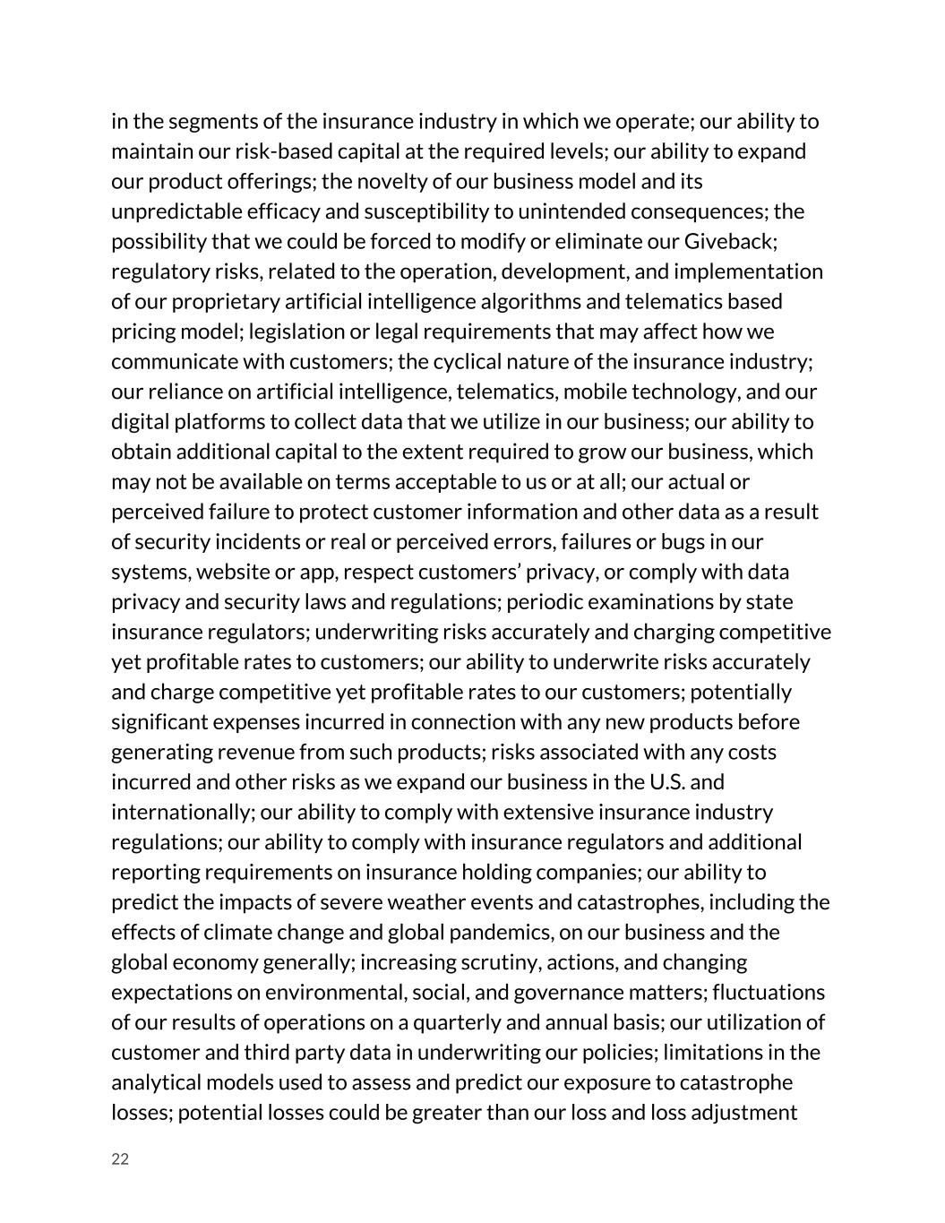 in the segments of the insurance industry in which we operate; our ability to maintain our risk-based capital at the required levels; our ability to expand our product offerings; the novelty of our business model and its unpredictable efficacy and susceptibility to unintended consequences; the possibility that we could be forced to modify or eliminate our Giveback; regulatory risks, related to the operation, development, and implementation of our proprietary artificial intelligence algorithms and telematics based pricing model; legislation or legal requirements that may affect how we communicate with customers; the cyclical nature of the insurance industry; our reliance on artificial intelligence, telematics, mobile technology, and our digital platforms to collect data that we utilize in our business; our ability to obtain additional capital to the extent required to grow our business, which may not be available on terms acceptable to us or at all; our actual or perceived failure to protect customer information and other data as a result of security incidents or real or perceived errors, failures or bugs in our systems, website or app, respect customers’ privacy, or comply with data privacy and security laws and regulations; periodic examinations by state insurance regulators; underwriting risks accurately and charging competitive yet profitable rates to customers; our ability to underwrite risks accurately and charge competitive yet profitable rates to our customers; potentially significant expenses incurred in connection with any new products before generating revenue from such products; risks associated with any costs incurred and other risks as we expand our business in the U.S. and internationally; our ability to comply with extensive insurance industry regulations; our ability to comply with insurance regulators and additional reporting requirements on insurance holding companies; our ability to predict the impacts of severe weather events and catastrophes, including the effects of climate change and global pandemics, on our business and the global economy generally; increasing scrutiny, actions, and changing expectations on environmental, social, and governance matters; fluctuations of our results of operations on a quarterly and annual basis; our utilization of customer and third party data in underwriting our policies; limitations in the analytical models used to assess and predict our exposure to catastrophe losses; potential losses could be greater than our loss and loss adjustment 22