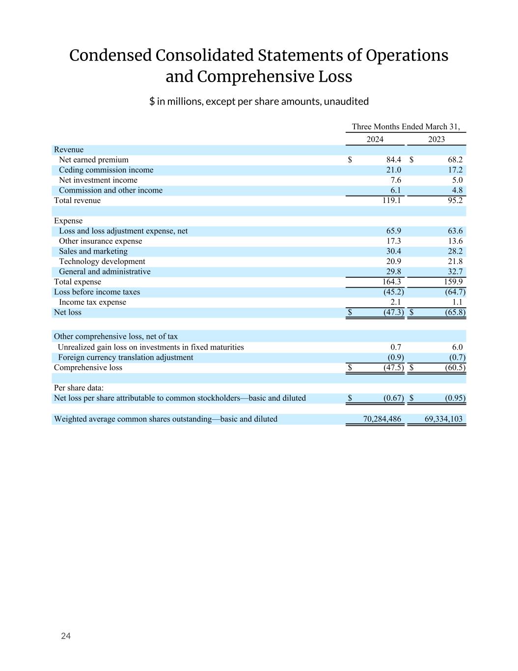 Condensed Consolidated Statements of Operations and Comprehensive Loss $ in millions, except per share amounts, unaudited Three Months Ended March 31, 2024 2023 Revenue Net earned premium $ 84.4 $ 68.2 Ceding commission income 21.0 17.2 Net investment income 7.6 5.0 Commission and other income 6.1 4.8 Total revenue 119.1 95.2 Expense Loss and loss adjustment expense, net 65.9 63.6 Other insurance expense 17.3 13.6 Sales and marketing 30.4 28.2 Technology development 20.9 21.8 General and administrative 29.8 32.7 Total expense 164.3 159.9 Loss before income taxes (45.2) (64.7) Income tax expense 2.1 1.1 Net loss $ (47.3) $ (65.8) Other comprehensive loss, net of tax Unrealized gain loss on investments in fixed maturities 0.7 6.0 Foreign currency translation adjustment (0.9) (0.7) Comprehensive loss $ (47.5) $ (60.5) Per share data: Net loss per share attributable to common stockholders—basic and diluted $ (0.67) $ (0.95) Weighted average common shares outstanding—basic and diluted 70,284,486 69,334,103 24