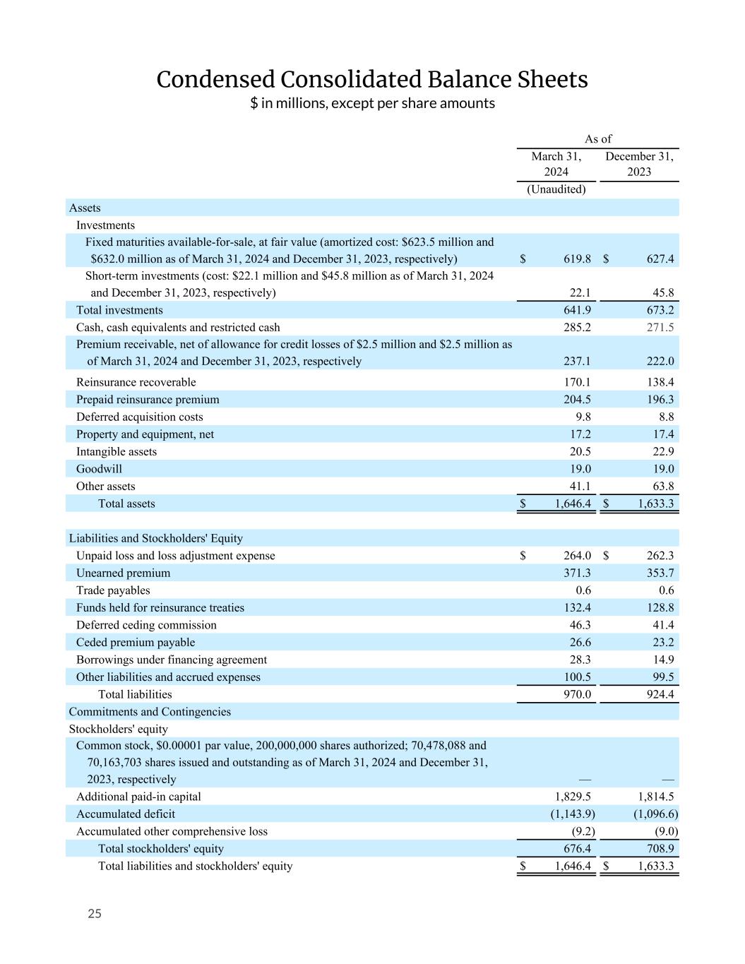 Condensed Consolidated Balance Sheets $ in millions, except per share amounts As of March 31, December 31, 2024 2023 (Unaudited) Assets Investments Fixed maturities available-for-sale, at fair value (amortized cost: $623.5 million and $632.0 million as of March 31, 2024 and December 31, 2023, respectively) $ 619.8 $ 627.4 Short-term investments (cost: $22.1 million and $45.8 million as of March 31, 2024 and December 31, 2023, respectively) 22.1 45.8 Total investments 641.9 673.2 Cash, cash equivalents and restricted cash 285.2 271.5 Premium receivable, net of allowance for credit losses of $2.5 million and $2.5 million as of March 31, 2024 and December 31, 2023, respectively 237.1 222.0 Reinsurance recoverable 170.1 138.4 Prepaid reinsurance premium 204.5 196.3 Deferred acquisition costs 9.8 8.8 Property and equipment, net 17.2 17.4 Intangible assets 20.5 22.9 Goodwill 19.0 19.0 Other assets 41.1 63.8 Total assets $ 1,646.4 $ 1,633.3 Liabilities and Stockholders' Equity Unpaid loss and loss adjustment expense $ 264.0 $ 262.3 Unearned premium 371.3 353.7 Trade payables 0.6 0.6 Funds held for reinsurance treaties 132.4 128.8 Deferred ceding commission 46.3 41.4 Ceded premium payable 26.6 23.2 Borrowings under financing agreement 28.3 14.9 Other liabilities and accrued expenses 100.5 99.5 Total liabilities 970.0 924.4 Commitments and Contingencies Stockholders' equity Common stock, $0.00001 par value, 200,000,000 shares authorized; 70,478,088 and 70,163,703 shares issued and outstanding as of March 31, 2024 and December 31, 2023, respectively — — Additional paid-in capital 1,829.5 1,814.5 Accumulated deficit (1,143.9) (1,096.6) Accumulated other comprehensive loss (9.2) (9.0) Total stockholders' equity 676.4 708.9 Total liabilities and stockholders' equity $ 1,646.4 $ 1,633.3 25