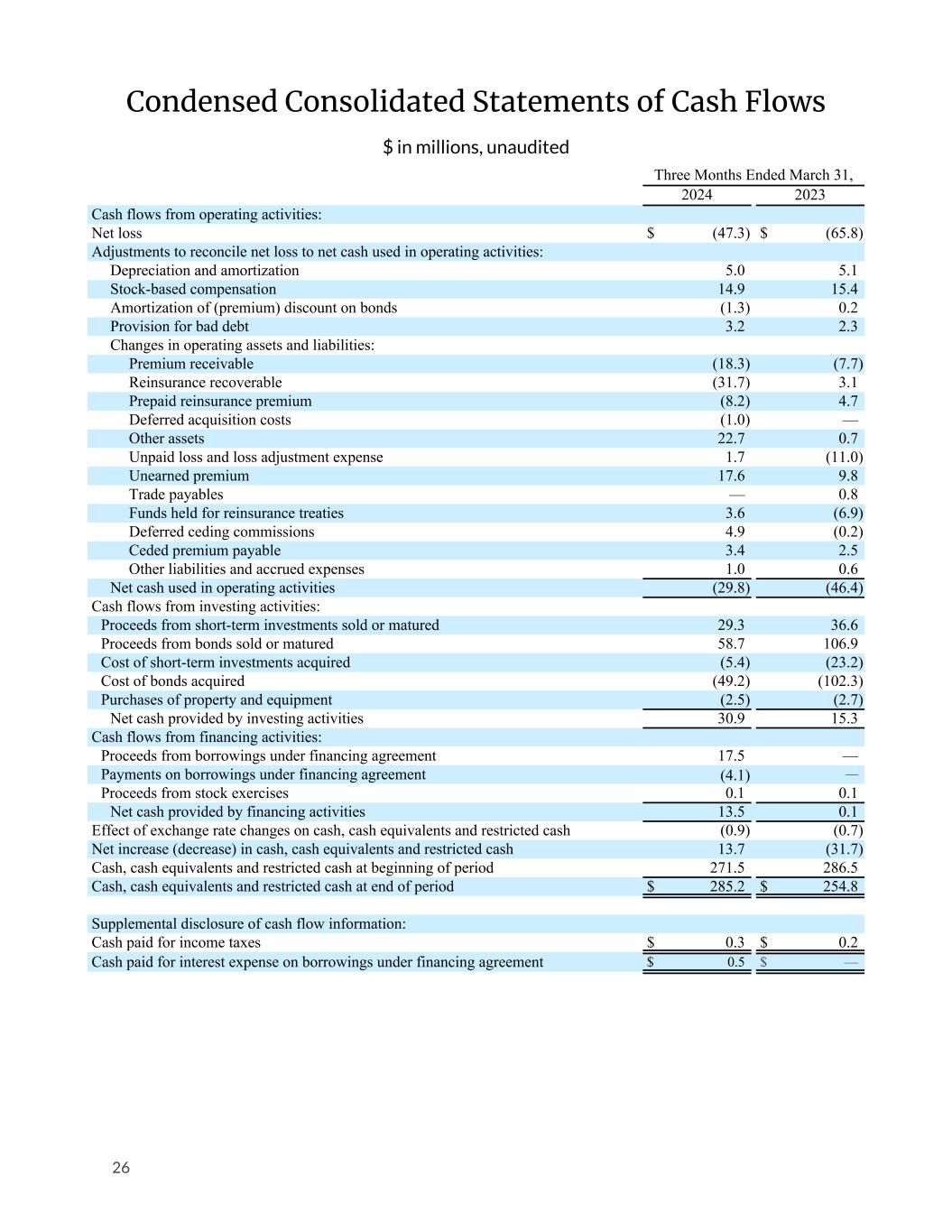 Condensed Consolidated Statements of Cash Flows $ in millions, unaudited Three Months Ended March 31, 2024 2023 Cash flows from operating activities: Net loss $ (47.3) $ (65.8) Adjustments to reconcile net loss to net cash used in operating activities: Depreciation and amortization 5.0 5.1 Stock-based compensation 14.9 15.4 Amortization of (premium) discount on bonds (1.3) 0.2 Provision for bad debt 3.2 2.3 Changes in operating assets and liabilities: Premium receivable (18.3) (7.7) Reinsurance recoverable (31.7) 3.1 Prepaid reinsurance premium (8.2) 4.7 Deferred acquisition costs (1.0) — Other assets 22.7 0.7 Unpaid loss and loss adjustment expense 1.7 (11.0) Unearned premium 17.6 9.8 Trade payables — 0.8 Funds held for reinsurance treaties 3.6 (6.9) Deferred ceding commissions 4.9 (0.2) Ceded premium payable 3.4 2.5 Other liabilities and accrued expenses 1.0 0.6 Net cash used in operating activities (29.8) (46.4) Cash flows from investing activities: Proceeds from short-term investments sold or matured 29.3 36.6 Proceeds from bonds sold or matured 58.7 106.9 Cost of short-term investments acquired (5.4) (23.2) Cost of bonds acquired (49.2) (102.3) Purchases of property and equipment (2.5) (2.7) Net cash provided by investing activities 30.9 15.3 Cash flows from financing activities: Proceeds from borrowings under financing agreement 17.5 — Payments on borrowings under financing agreement (4.1) — Proceeds from stock exercises 0.1 0.1 Net cash provided by financing activities 13.5 0.1 Effect of exchange rate changes on cash, cash equivalents and restricted cash (0.9) (0.7) Net increase (decrease) in cash, cash equivalents and restricted cash 13.7 (31.7) Cash, cash equivalents and restricted cash at beginning of period 271.5 286.5 Cash, cash equivalents and restricted cash at end of period $ 285.2 $ 254.8 Supplemental disclosure of cash flow information: Cash paid for income taxes $ 0.3 $ 0.2 Cash paid for interest expense on borrowings under financing agreement $ 0.5 $ — 26