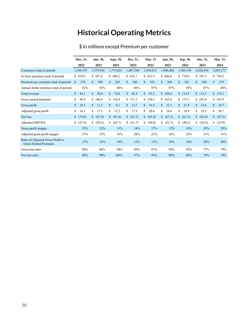 Historical Operating Metrics $ in millions except Premium per customer Mar. 31, Jun. 30, Sept. 30, Dec. 31, Mar. 31 Jun. 30, Sep. 30, Dec. 31, Mar. 31, 2022 2022 2022 2022 2023 2023 2023 2023 2024 Customers (end of period) 1,504,197 1,579,936 1,775,824 1,807,548 1,856,012 1,906,408 1,984,154 2,026,918 2,095,275 In force premium (end of period) $ 419.0 $ 457.6 $ 609.2 $ 625.1 $ 653.3 $ 686.6 $ 719.0 $ 747.3 $ 794.2 Premium per customer (end of period) $ 279 $ 290 $ 343 $ 346 $ 352 $ 360 $ 362 $ 369 $ 379 Annual dollar retention (end of period) 82% 83% 84% 86% 87% 87% 85% 87% 88% Total revenue $ 44.3 $ 50.0 $ 74.0 $ 88.4 $ 95.2 $ 104.6 $ 114.5 $ 115.5 $ 119.1 Gross earned premium $ 96.0 $ 106.8 $ 136.4 $ 151.3 $ 154.2 $ 163.9 $ 173.2 $ 181.0 $ 187.9 Gross profit $ 10.2 $ 11.3 $ 8.1 $ 12.7 $ 16.5 $ 12.1 $ 21.9 $ 33.6 $ 34.7 Adjusted gross profit $ 16.3 $ 17.5 $ 13.2 $ 17.9 $ 20.6 $ 16.6 $ 24.9 $ 35.3 $ 36.7 Net loss $ (74.8) $ (67.9) $ (91.4) $ (63.7) $ (65.8) $ (67.2) $ (61.5) $ (42.4) $ (47.3) Adjusted EBITDA $ (57.4) $ (50.3) $ (65.7) $ (51.7) $ (50.8) $ (52.7) $ (40.2) $ (28.9) $ (33.9) Gross profit margin 23% 23% 11% 14% 17% 12% 19% 29% 29% Adjusted gross profit margin 37% 35% 18% 20% 22% 16% 22% 31% 31% Ratio of Adjusted Gross Profit to Gross Earned Premium 17% 16% 10% 12% 13% 10% 14% 20% 20% Gross loss ratio 90% 86% 94% 89% 87% 94% 83% 77% 79% Net loss ratio 89% 90% 105% 97% 93% 99% 88% 78% 78% 30