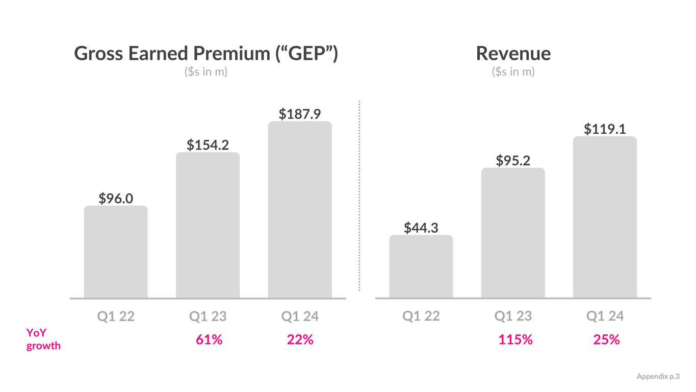Gross Earned Premium (“GEP”) ($s in m) Revenue ($s in m) $44.3 $95.2 $119.1 Q1 22 Q1 23 Q1 24 25%115%YoY growth $96.0 $154.2 $187.9 Q1 22 Q1 23 Q1 24 22% 61% Appendix p.3