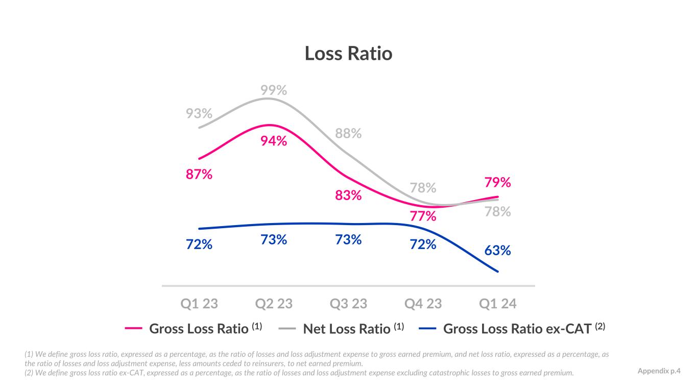 Ratio of Adjusted Gross Profit to Gross Earned Premium The following table sets forth our calculation of the Ratio of Adjusted Gross Profit to Gross Earned Premium for the periods presented: Three Months Ended March 31, 2024 2023 ($ in millions) Numerator: Adjusted gross profit $ 36.7 $ 20.6 Denominator: Gross earned premium $ 187.9 $ 154.2 Ratio of Adjusted Gross Profit to Gross Earned Premium 20% 13% Adjusted EBITDA The following table provides a reconciliation of adjusted EBITDA to net loss for the periods presented: Three Months Ended March 31, 2024 2023 ($ in millions) Net loss $ (47.3) $ (65.8) Adjustments: Income tax expense 2.1 1.1 Depreciation and amortization 5.0 5.2 Stock-based compensation (1) 14.9 15.4 Interest expense 0.6 — Interest income and others (1.5) (0.7) Net investment income (7.6) (5.0) Change in fair value of warrants liability — (0.3) Amortization of fair value adjustment on insurance contract intangible liability relating to the Metromile acquisition (0.1) (0.7) Adjusted EBITDA $ (33.9) $ (50.8) (1) Includes compensation expense related to warrant shares of $0.9 million for the three months ended March 31, 2024, and none for the three months ended March 31, 2023. 28