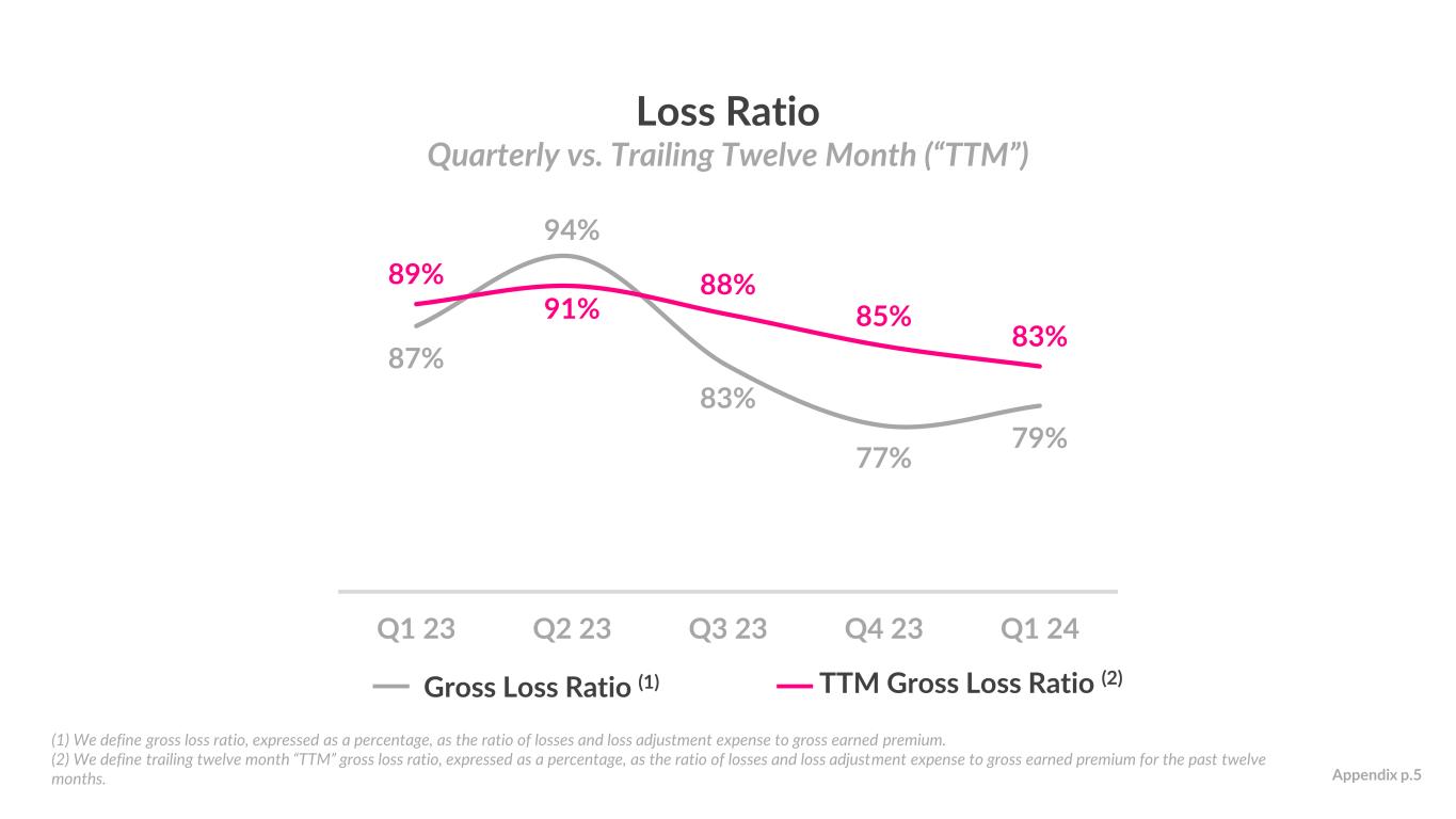 87% 94% 83% 77% 79% 93% 99% 88% 78% 78% 72% 73% 73% 72% 63% Q1 23 Q2 23 Q3 23 Q4 23 Q1 24 Loss Ratio Gross Loss Ratio (1) Net Loss Ratio (1) (1) We define gross loss ratio, expressed as a percentage, as the ratio of losses and loss adjustment expense to gross earned premium, and net loss ratio, expressed as a percentage, as the ratio of losses and loss adjustment expense, less amounts ceded to reinsurers, to net earned premium. (2) We define gross loss ratio ex-CAT, expressed as a percentage, as the ratio of losses and loss adjustment expense excluding catastrophic losses to gross earned premium. Appendix p.4 Gross Loss Ratio ex-CAT (2)