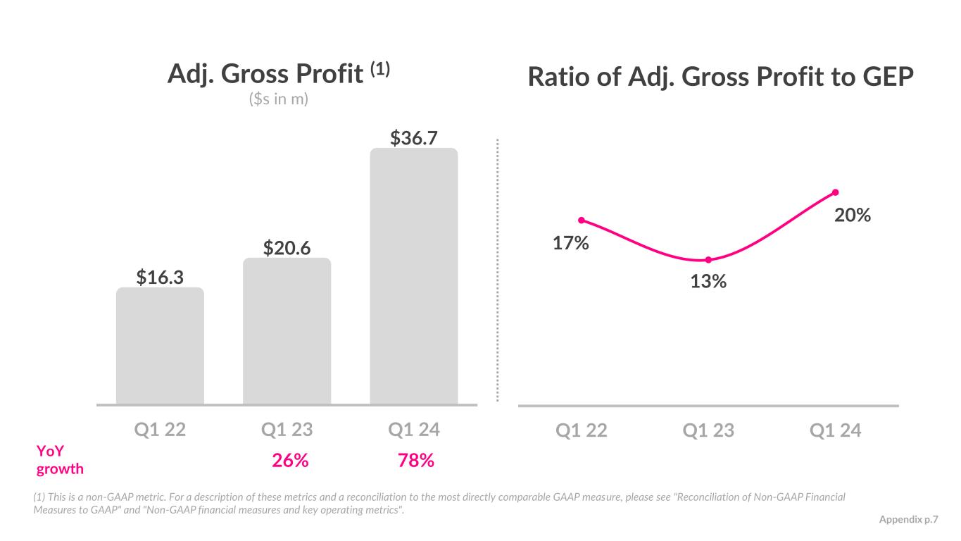 Adj. Gross Profit (1) ($s in m) Ratio of Adj. Gross Profit to GEP $16.3 $20.6 $36.7 Q1 22 Q1 23 Q1 24 78%26% (1) This is a non-GAAP metric. For a description of these metrics and a reconciliation to the most directly comparable GAAP measure, please see "Reconciliation of Non-GAAP Financial Measures to GAAP" and "Non-GAAP financial measures and key operating metrics". 17% 13% 20% Q1 22 Q1 23 Q1 24 YoY growth Appendix p.7