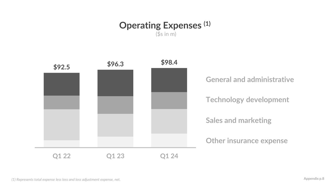 $92.5 $96.3 $98.4 Q1 22 Q1 23 Q1 24 Other insurance expense Sales and marketing Technology development General and administrative Operating Expenses (1) ($s in m) (1) Represents total expense less loss and loss adjustment expense, net. Appendix p.8