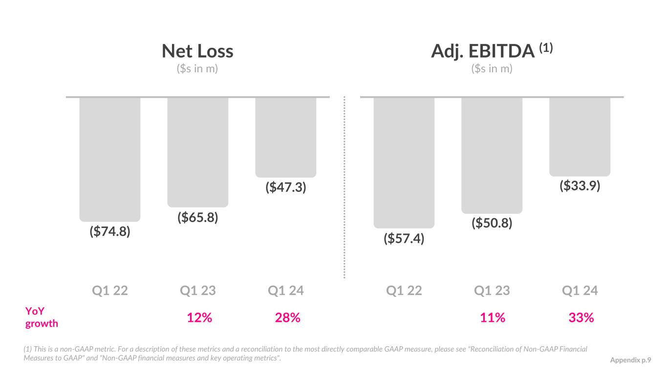 Net Loss ($s in m) Adj. EBITDA (1) ($s in m) 33%11% YoY growth 28% 12% (1) This is a non-GAAP metric. For a description of these metrics and a reconciliation to the most directly comparable GAAP measure, please see "Reconciliation of Non-GAAP Financial Measures to GAAP" and "Non-GAAP financial measures and key operating metrics". Appendix p.9 ($74.8) ($65.8) ($47.3) Q1 22 Q1 23 Q1 24 ($57.4) ($50.8) ($33.9) Q1 22 Q1 23 Q1 24