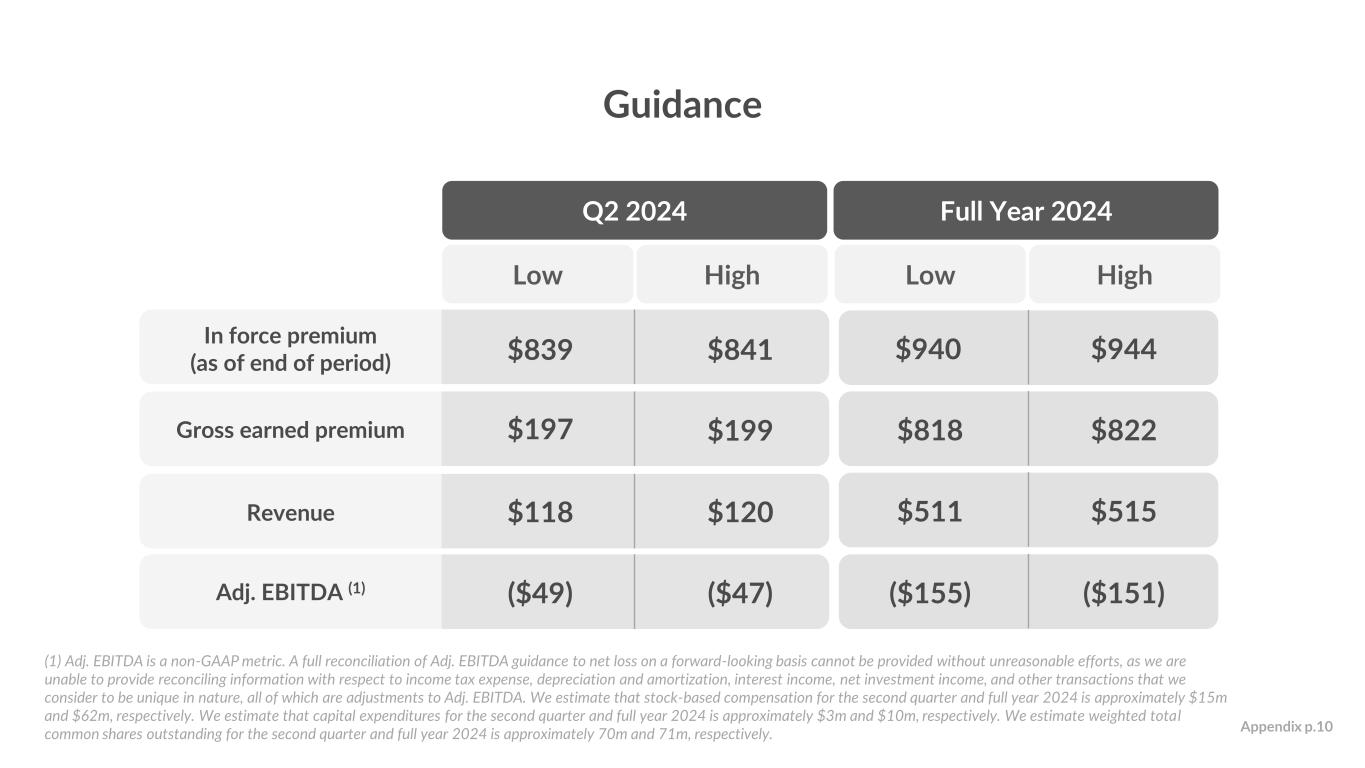 Guidance ($s in m) Q2 2024 Full Year 2024 $839 $841 $197 $199 $118 $120 ($49) ($47) ($155) ($151) $511 $515 $818 $822 $940 $944 Low High Low High In force premium (as of end of period) Gross earned premium Revenue Adj. EBITDA (1) (1) Adj. EBITDA is a non-GAAP metric. A full reconciliation of Adj. EBITDA guidance to net loss on a forward-looking basis cannot be provided without unreasonable efforts, as we are unable to provide reconciling information with respect to income tax expense, depreciation and amortization, interest income, net investment income, and other transactions that we consider to be unique in nature, all of which are adjustments to Adj. EBITDA. We estimate that stock-based compensation for the second quarter and full year 2024 is approximately $15m and $62m, respectively. We estimate that capital expenditures for the second quarter and full year 2024 is approximately $3m and $10m, respectively. We estimate weighted total common shares outstanding for the second quarter and full year 2024 is approximately 70m and 71m, respectively. Appendix p.10