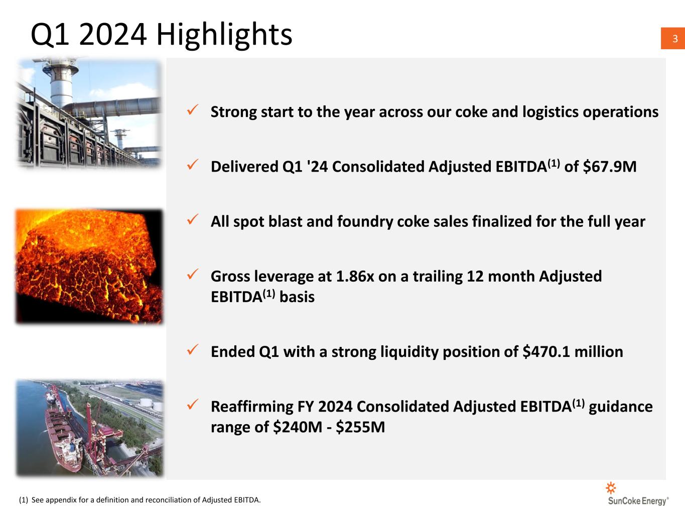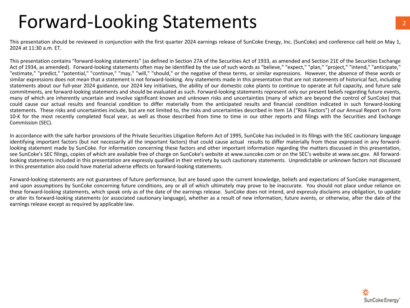 2 This presentation should be reviewed in conjunction with the first quarter 2024 earnings release of SunCoke Energy, Inc. (SunCoke) and conference call held on May 1, 2024 at 11:30 a.m. ET. This presentation contains “forward-looking statements” (as defined in Section 27A of the Securities Act of 1933, as amended and Section 21E of the Securities Exchange Act of 1934, as amended). Forward-looking statements often may be identified by the use of such words as "believe," "expect," "plan," "project," "intend," "anticipate," "estimate," "predict," "potential," "continue," "may," "will," "should," or the negative of these terms, or similar expressions. However, the absence of these words or similar expressions does not mean that a statement is not forward-looking. Any statements made in this presentation that are not statements of historical fact, including statements about our full-year 2024 guidance, our 2024 key initiatives, the ability of our domestic coke plants to continue to operate at full capacity, and future sale commitments, are forward-looking statements and should be evaluated as such. Forward-looking statements represent only our present beliefs regarding future events, many of which are inherently uncertain and involve significant known and unknown risks and uncertainties (many of which are beyond the control of SunCoke) that could cause our actual results and financial condition to differ materially from the anticipated results and financial condition indicated in such forward-looking statements. These risks and uncertainties include, but are not limited to, the risks and uncertainties described in Item 1A (“Risk Factors”) of our Annual Report on Form 10-K for the most recently completed fiscal year, as well as those described from time to time in our other reports and filings with the Securities and Exchange Commission (SEC). In accordance with the safe harbor provisions of the Private Securities Litigation Reform Act of 1995, SunCoke has included in its filings with the SEC cautionary language identifying important factors (but not necessarily all the important factors) that could cause actual results to differ materially from those expressed in any forward- looking statement made by SunCoke. For information concerning these factors and other important information regarding the matters discussed in this presentation, see SunCoke’s SEC filings, copies of which are available free of charge on SunCoke's website at www.suncoke.com or on the SEC’s website at www.sec.gov. All forward- looking statements included in this presentation are expressly qualified in their entirety by such cautionary statements. Unpredictable or unknown factors not discussed in this presentation also could have material adverse effects on forward-looking statements. Forward-looking statements are not guarantees of future performance, but are based upon the current knowledge, beliefs and expectations of SunCoke management, and upon assumptions by SunCoke concerning future conditions, any or all of which ultimately may prove to be inaccurate. You should not place undue reliance on these forward-looking statements, which speak only as of the date of the earnings release. SunCoke does not intend, and expressly disclaims any obligation, to update or alter its forward-looking statements (or associated cautionary language), whether as a result of new information, future events, or otherwise, after the date of the earnings release except as required by applicable law. Forward-Looking Statements