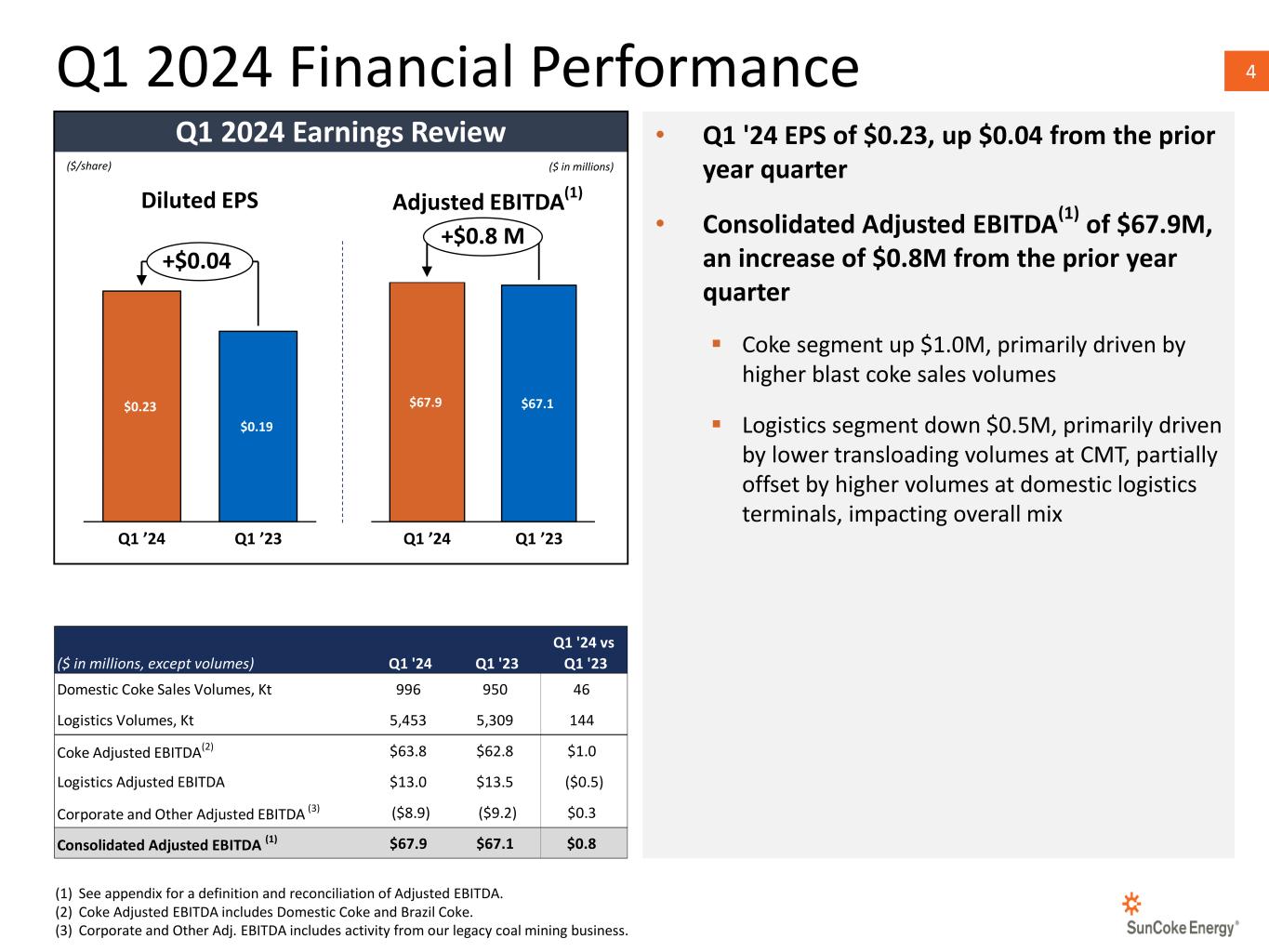 3Q1 2024 Highlights ✓ Strong start to the year across our coke and logistics operations ✓ Delivered Q1 '24 Consolidated Adjusted EBITDA(1) of $67.9M ✓ All spot blast and foundry coke sales finalized for the full year ✓ Gross leverage at 1.86x on a trailing 12 month Adjusted EBITDA(1) basis ✓ Ended Q1 with a strong liquidity position of $470.1 million ✓ Reaffirming FY 2024 Consolidated Adjusted EBITDA(1) guidance range of $240M - $255M (1) See appendix for a definition and reconciliation of Adjusted EBITDA.