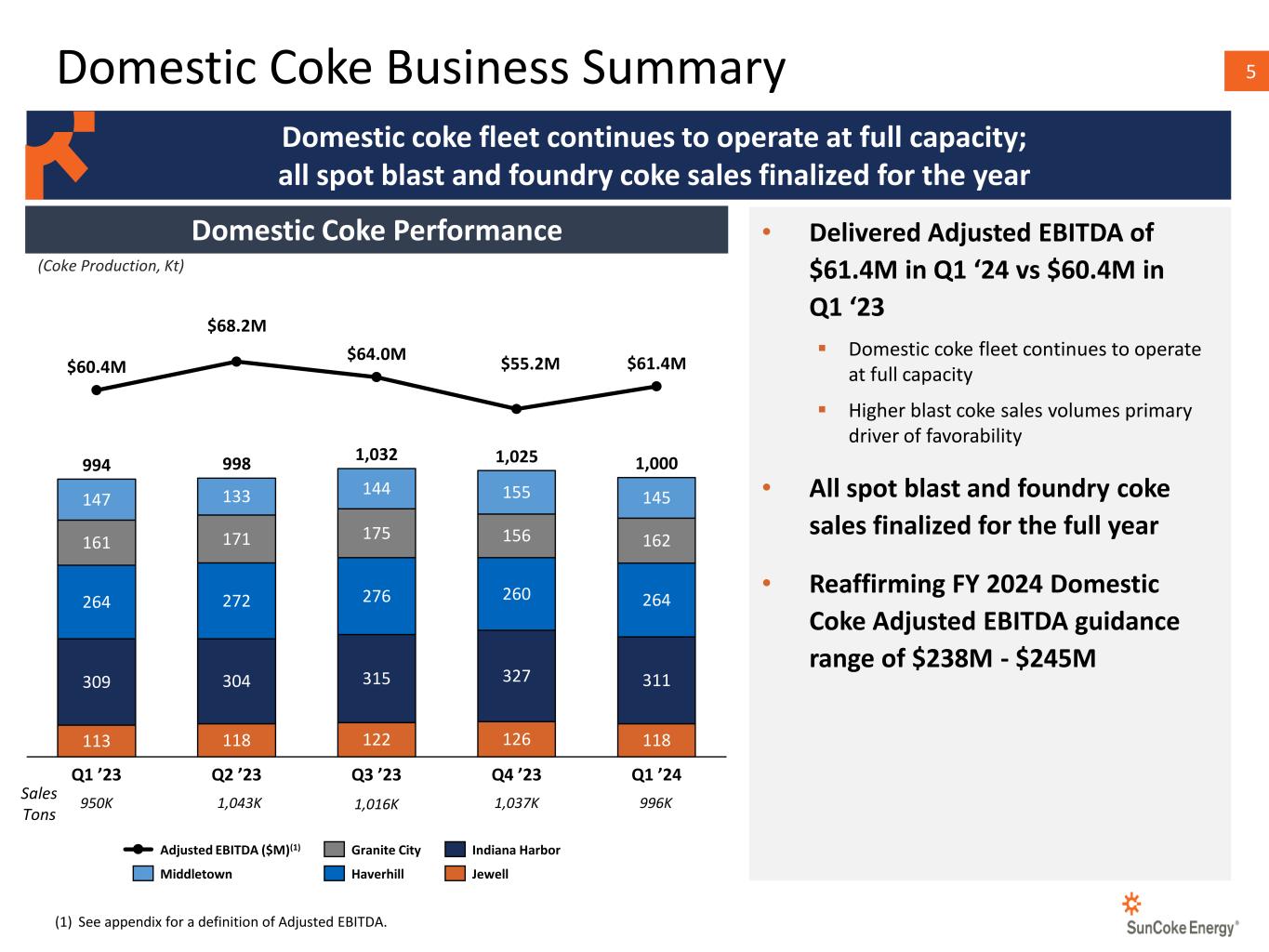 4Q1 2024 Financial Performance (1) See appendix for a definition and reconciliation of Adjusted EBITDA. (2) Coke Adjusted EBITDA includes Domestic Coke and Brazil Coke. (3) Corporate and Other Adj. EBITDA includes activity from our legacy coal mining business. ($/share) ($ in millions) Adjusted EBITDA(1) $67.9 $67.1 Q1 ’24 Q1 ’23 +$0.8 M Q1 2024 Earnings Review • Q1 '24 EPS of $0.23, up $0.04 from the prior year quarter • Consolidated Adjusted EBITDA (1) of $67.9M, an increase of $0.8M from the prior year quarter ▪ Coke segment up $1.0M, primarily driven by higher blast coke sales volumes ▪ Logistics segment down $0.5M, primarily driven by lower transloading volumes at CMT, partially offset by higher volumes at domestic logistics terminals, impacting overall mix $0.23 $0.19 Q1 ’24 Q1 ’23 +$0.04 Diluted EPS ($ in millions, except volumes) Q1 '24 Q1 '23 Q1 '24 vs Q1 '23 Domestic Coke Sales Volumes, Kt 996 950 46 Logistics Volumes, Kt 5,453 5,309 144 Coke Adjusted EBITDA(2) $63.8 $62.8 $1.0 Logistics Adjusted EBITDA $13.0 $13.5 ($0.5) Corporate and Other Adjusted EBITDA (3) ($8.9) ($9.2) $0.3 Consolidated Adjusted EBITDA (1) $67.9 $67.1 $0.8