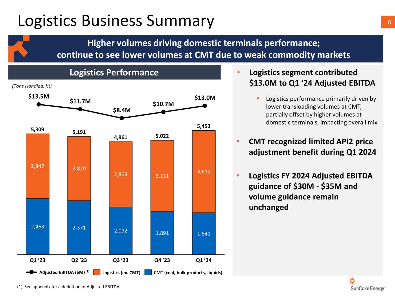 Logistics Logistics consists of the handling and mixing services of coal and other aggregates at our Convent Marine Terminal ("CMT"), Lake Terminal, and Kanawha River Terminals (“KRT”). Three Months Ended March 31, (Dollars in millions, except per ton amounts) 2024 2023 Increase (decrease) Revenues $ 20.6 $ 21.1 $ (0.5) Intersegment sales $ 5.9 $ 6.2 $ (0.3) Adjusted EBITDA(1) $ 13.0 $ 13.5 $ (0.5) Tons handled (thousands of tons)(2) 5,453 5,309 144 (1) See definition of Adjusted EBITDA elsewhere in this release. (2) Reflects inbound tons handled during the period. Revenues and Adjusted EBITDA both decreased by $0.5 million as compared to the same prior year period, primarily driven by lower transloading volumes at CMT, partially offset by higher volumes at domestic terminals. Brazil Coke Brazil Coke consists of a cokemaking facility in Vitória, Brazil, which we operate for an affiliate of ArcelorMittal. Revenues were $8.3 million and Adjusted EBITDA was $2.4 million during the first quarter 2024, which was reasonably consistent with the prior year period. Corporate and Other Corporate and Other, which includes activity from our legacy coal mining business, was $8.9 million during the first quarter 2024, which was reasonably consistent with $9.2 million during the first quarter 2023. 3