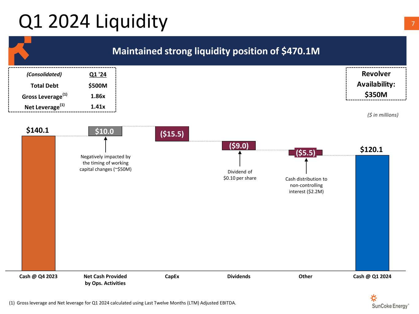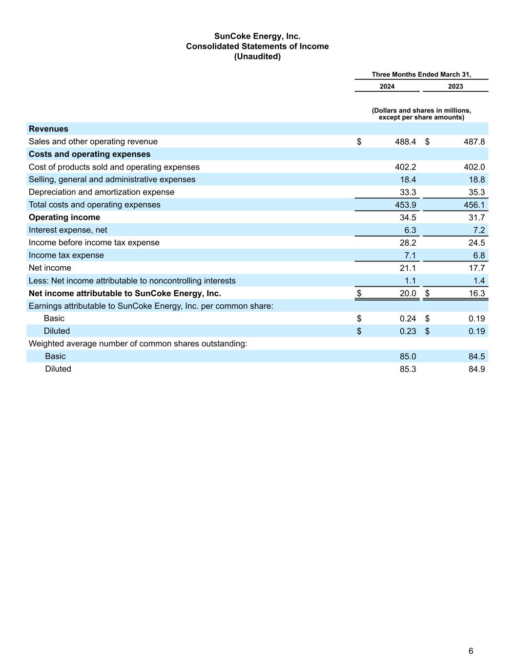 SunCoke Energy, Inc. Consolidated Statements of Income (Unaudited) (Dollars and shares in millions, except per share amounts) Revenues Sales and other operating revenue $ 488.4 $ 487.8 Costs and operating expenses Cost of products sold and operating expenses 402.2 402.0 Selling, general and administrative expenses 18.4 18.8 Depreciation and amortization expense 33.3 35.3 Total costs and operating expenses 453.9 456.1 Operating income 34.5 31.7 Interest expense, net 6.3 7.2 Income before income tax expense 28.2 24.5 Income tax expense 7.1 6.8 Net income 21.1 17.7 Less: Net income attributable to noncontrolling interests 1.1 1.4 Net income attributable to SunCoke Energy, Inc. $ 20.0 $ 16.3 Earnings attributable to SunCoke Energy, Inc. per common share: Basic $ 0.24 $ 0.19 Diluted $ 0.23 $ 0.19 Weighted average number of common shares outstanding: Basic 85.0 84.5 Diluted 85.3 84.9 Three Months Ended March 31, 2024 2023 6
