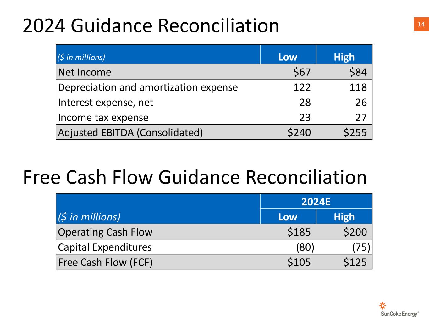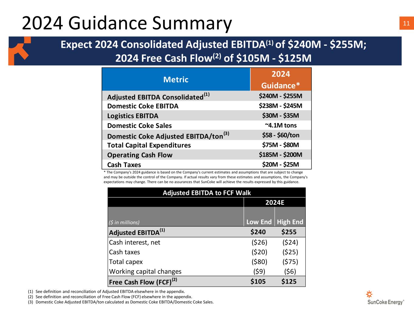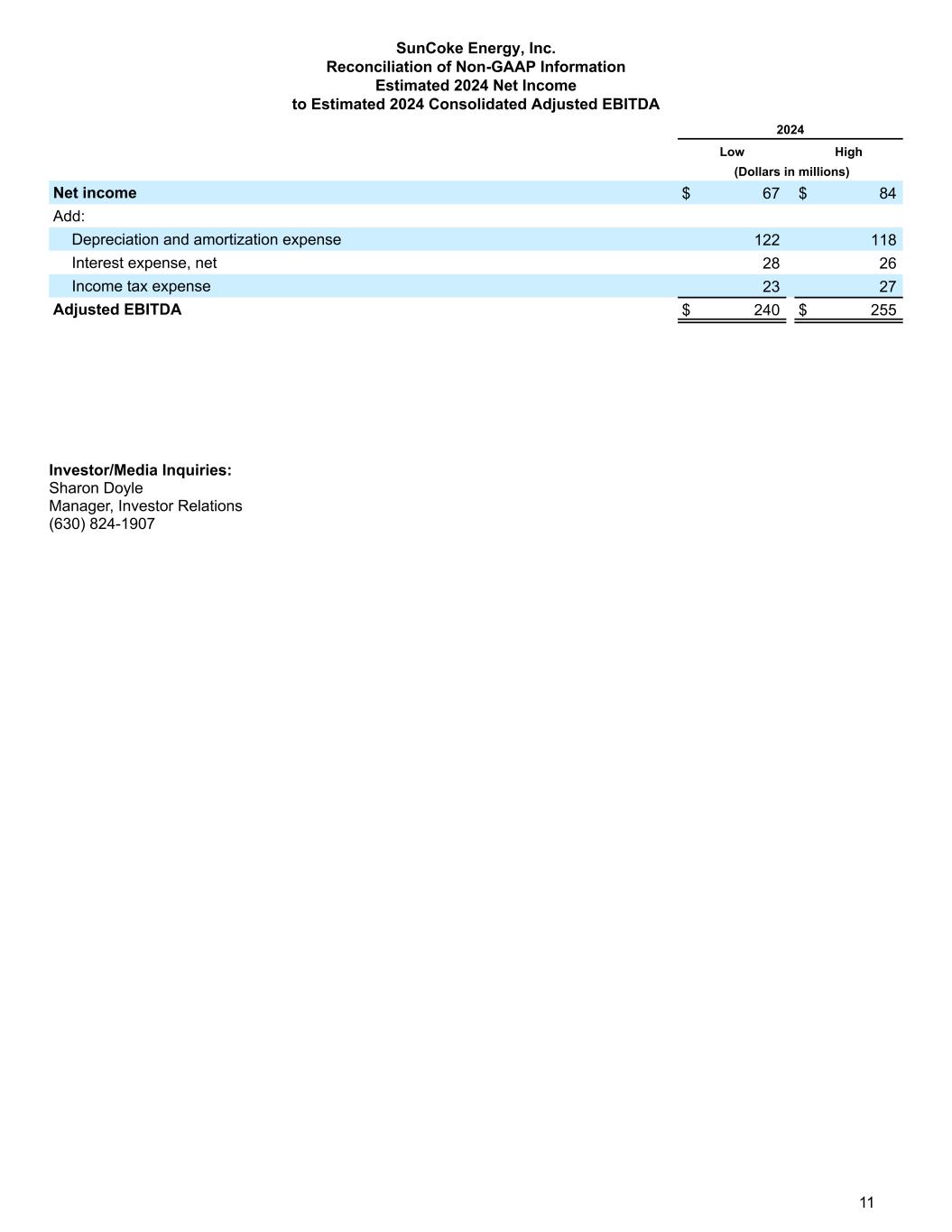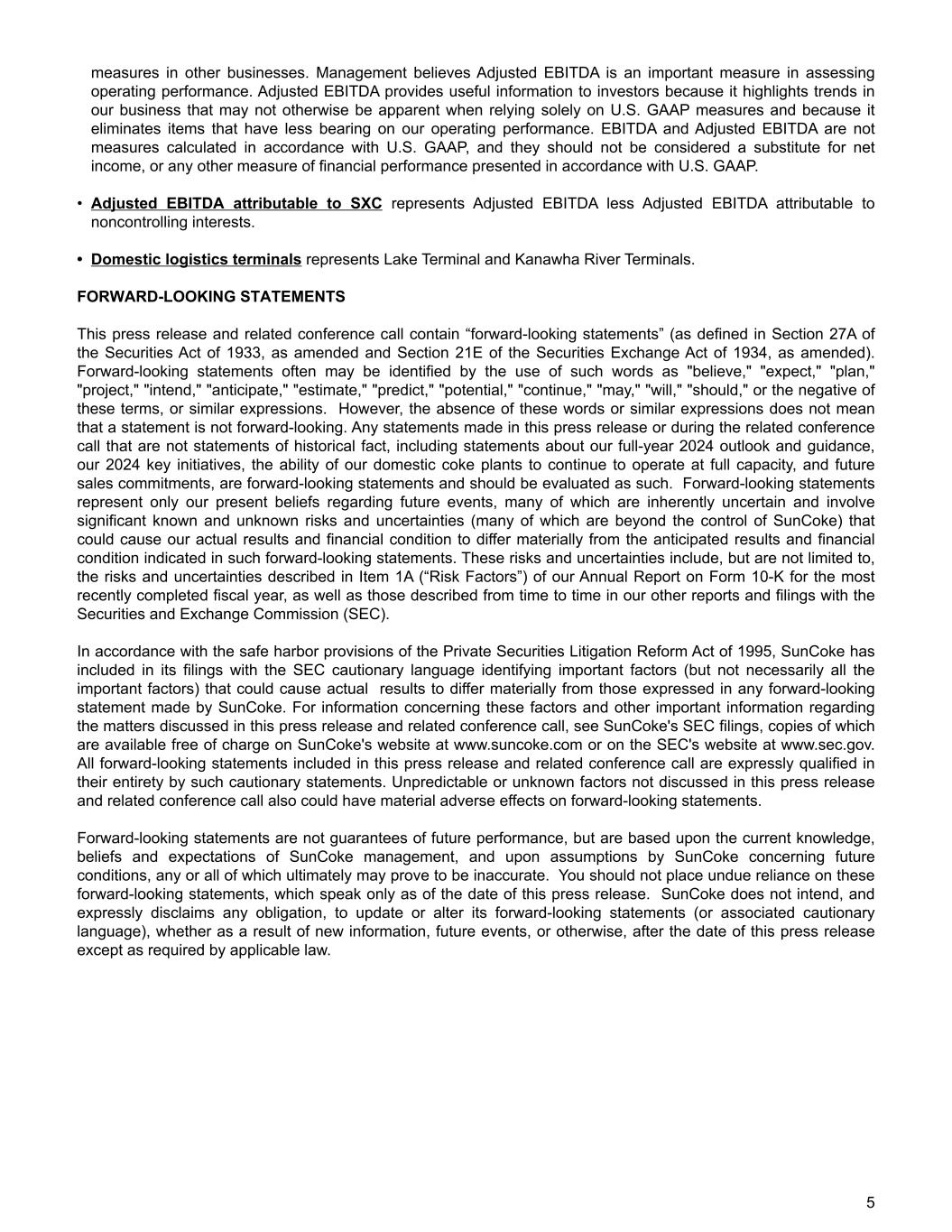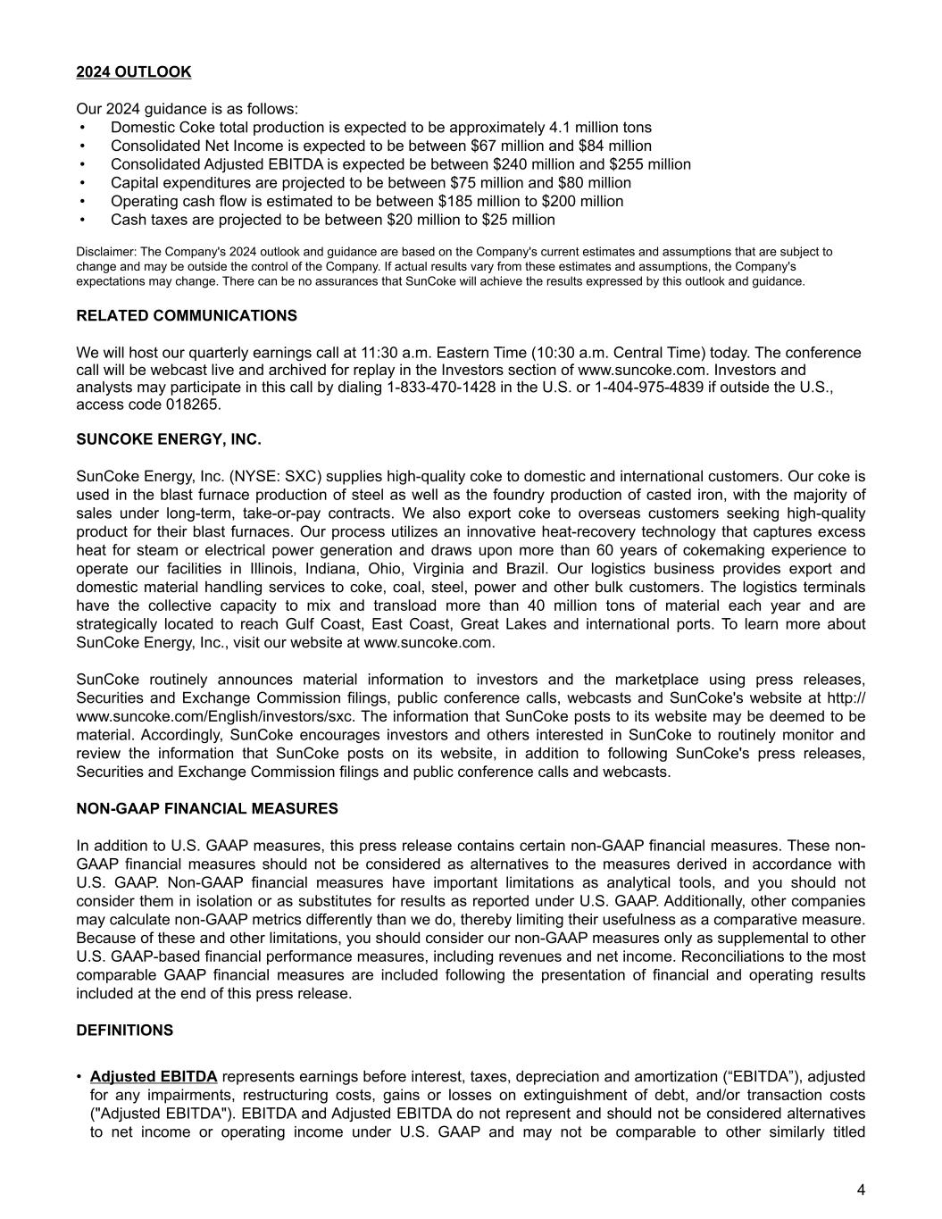 2024 OUTLOOK Our 2024 guidance is as follows: • Domestic Coke total production is expected to be approximately 4.1 million tons • Consolidated Net Income is expected to be between $67 million and $84 million • Consolidated Adjusted EBITDA is expected be between $240 million and $255 million • Capital expenditures are projected to be between $75 million and $80 million • Operating cash flow is estimated to be between $185 million to $200 million • Cash taxes are projected to be between $20 million to $25 million Disclaimer: The Company's 2024 outlook and guidance are based on the Company's current estimates and assumptions that are subject to change and may be outside the control of the Company. If actual results vary from these estimates and assumptions, the Company's expectations may change. There can be no assurances that SunCoke will achieve the results expressed by this outlook and guidance. RELATED COMMUNICATIONS We will host our quarterly earnings call at 11:30 a.m. Eastern Time (10:30 a.m. Central Time) today. The conference call will be webcast live and archived for replay in the Investors section of www.suncoke.com. Investors and analysts may participate in this call by dialing 1-833-470-1428 in the U.S. or 1-404-975-4839 if outside the U.S., access code 018265. SUNCOKE ENERGY, INC. SunCoke Energy, Inc. (NYSE: SXC) supplies high-quality coke to domestic and international customers. Our coke is used in the blast furnace production of steel as well as the foundry production of casted iron, with the majority of sales under long-term, take-or-pay contracts. We also export coke to overseas customers seeking high-quality product for their blast furnaces. Our process utilizes an innovative heat-recovery technology that captures excess heat for steam or electrical power generation and draws upon more than 60 years of cokemaking experience to operate our facilities in Illinois, Indiana, Ohio, Virginia and Brazil. Our logistics business provides export and domestic material handling services to coke, coal, steel, power and other bulk customers. The logistics terminals have the collective capacity to mix and transload more than 40 million tons of material each year and are strategically located to reach Gulf Coast, East Coast, Great Lakes and international ports. To learn more about SunCoke Energy, Inc., visit our website at www.suncoke.com. SunCoke routinely announces material information to investors and the marketplace using press releases, Securities and Exchange Commission filings, public conference calls, webcasts and SunCoke's website at http:// www.suncoke.com/English/investors/sxc. The information that SunCoke posts to its website may be deemed to be material. Accordingly, SunCoke encourages investors and others interested in SunCoke to routinely monitor and review the information that SunCoke posts on its website, in addition to following SunCoke's press releases, Securities and Exchange Commission filings and public conference calls and webcasts. NON-GAAP FINANCIAL MEASURES In addition to U.S. GAAP measures, this press release contains certain non-GAAP financial measures. These non- GAAP financial measures should not be considered as alternatives to the measures derived in accordance with U.S. GAAP. Non-GAAP financial measures have important limitations as analytical tools, and you should not consider them in isolation or as substitutes for results as reported under U.S. GAAP. Additionally, other companies may calculate non-GAAP metrics differently than we do, thereby limiting their usefulness as a comparative measure. Because of these and other limitations, you should consider our non-GAAP measures only as supplemental to other U.S. GAAP-based financial performance measures, including revenues and net income. Reconciliations to the most comparable GAAP financial measures are included following the presentation of financial and operating results included at the end of this press release. DEFINITIONS • Adjusted EBITDA represents earnings before interest, taxes, depreciation and amortization (“EBITDA”), adjusted for any impairments, restructuring costs, gains or losses on extinguishment of debt, and/or transaction costs ("Adjusted EBITDA"). EBITDA and Adjusted EBITDA do not represent and should not be considered alternatives to net income or operating income under U.S. GAAP and may not be comparable to other similarly titled 4