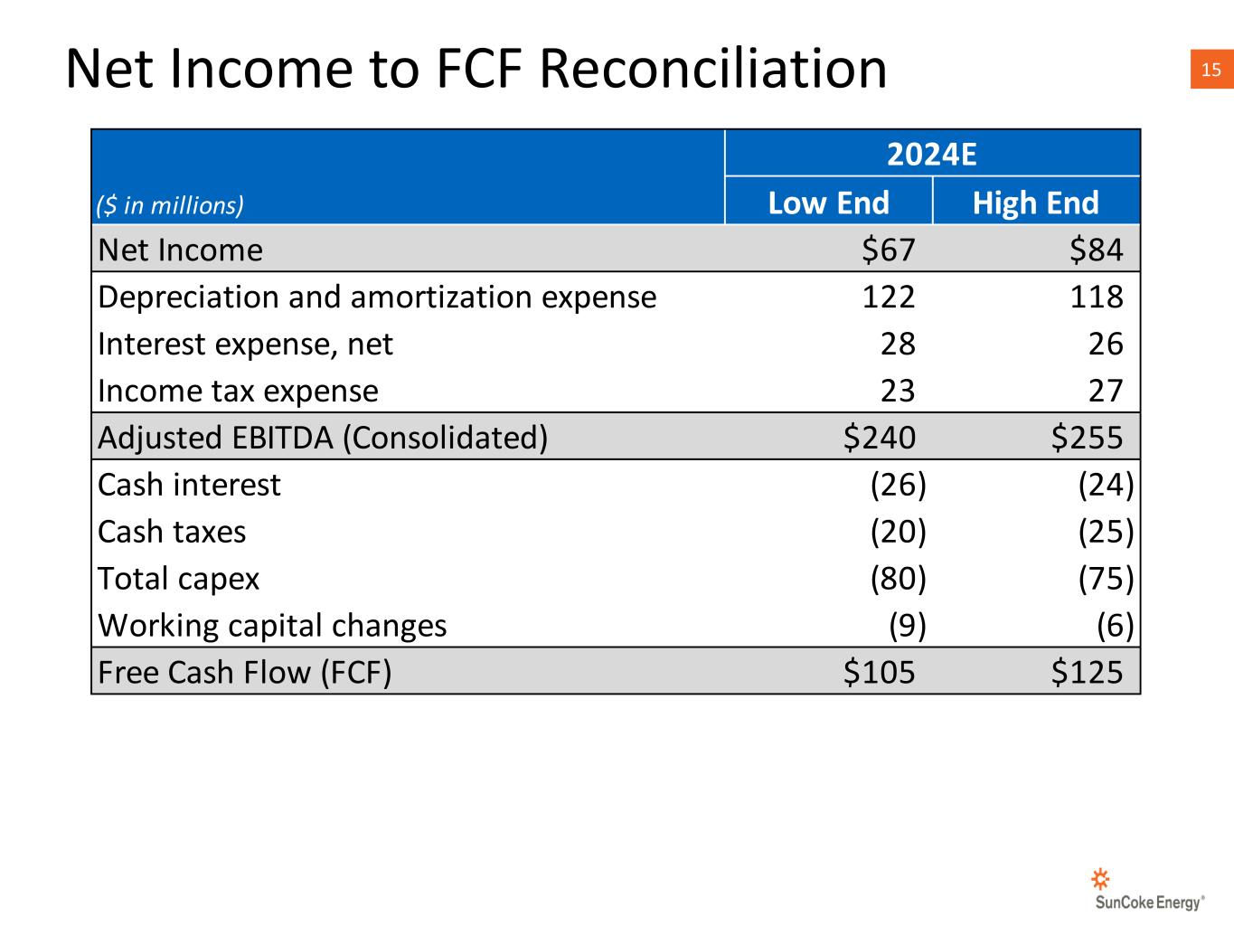 142024 Guidance Reconciliation Free Cash Flow Guidance Reconciliation Low High Net Income $67 $84 Depreciation and amortization expense 122 118 Interest expense, net 28 26 Income tax expense 23 27 Adjusted EBITDA (Consolidated) $240 $255 ($ in millions) ($ in millions) Low High Operating Cash Flow $185 $200 Capital Expenditures (80) (75) Free Cash Flow (FCF) $105 $125 2024E