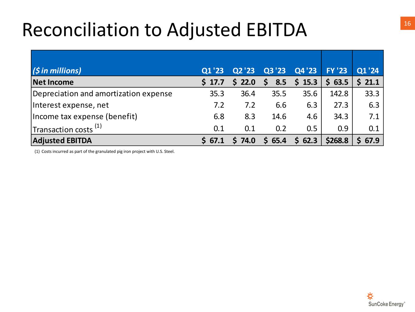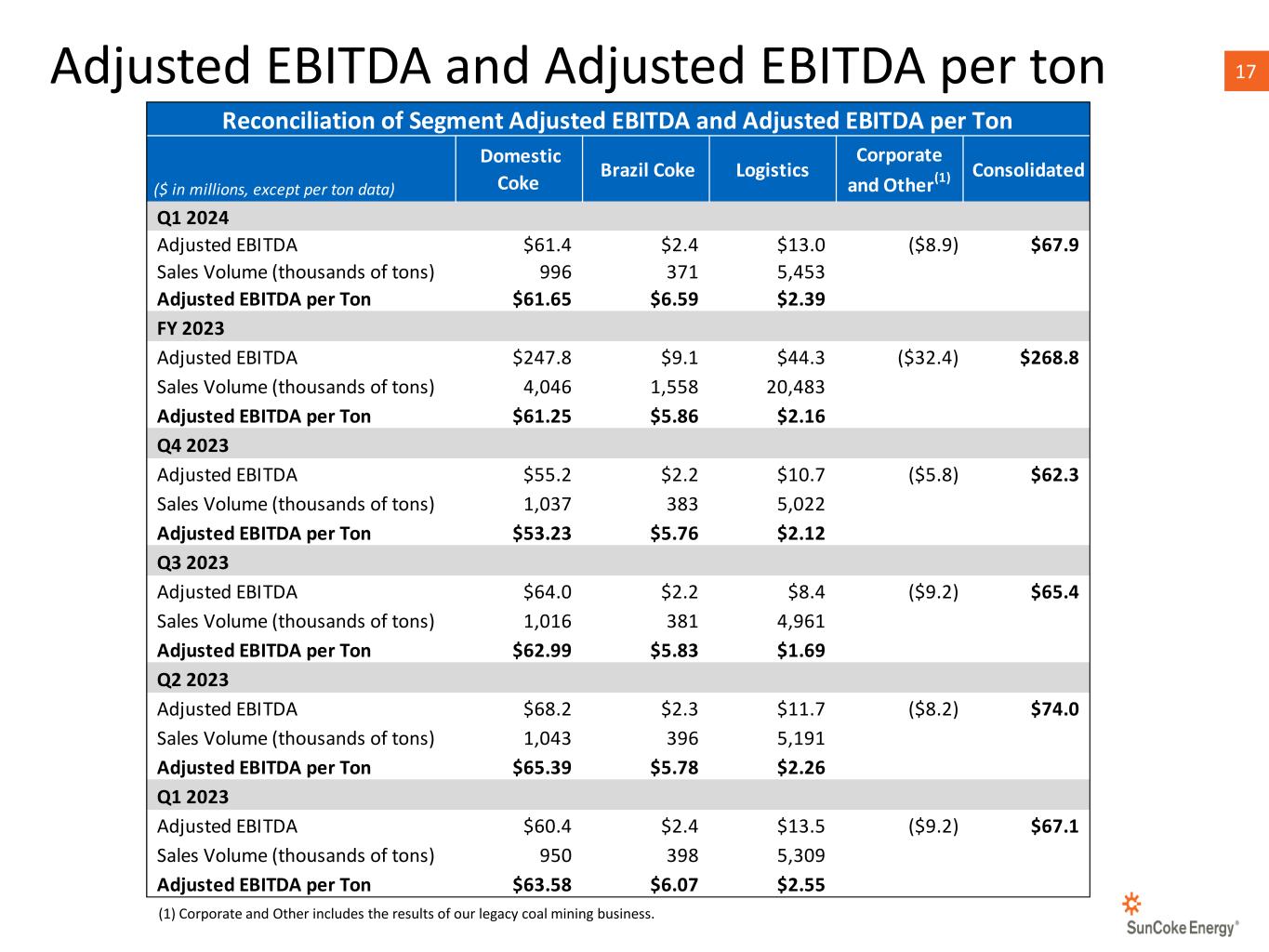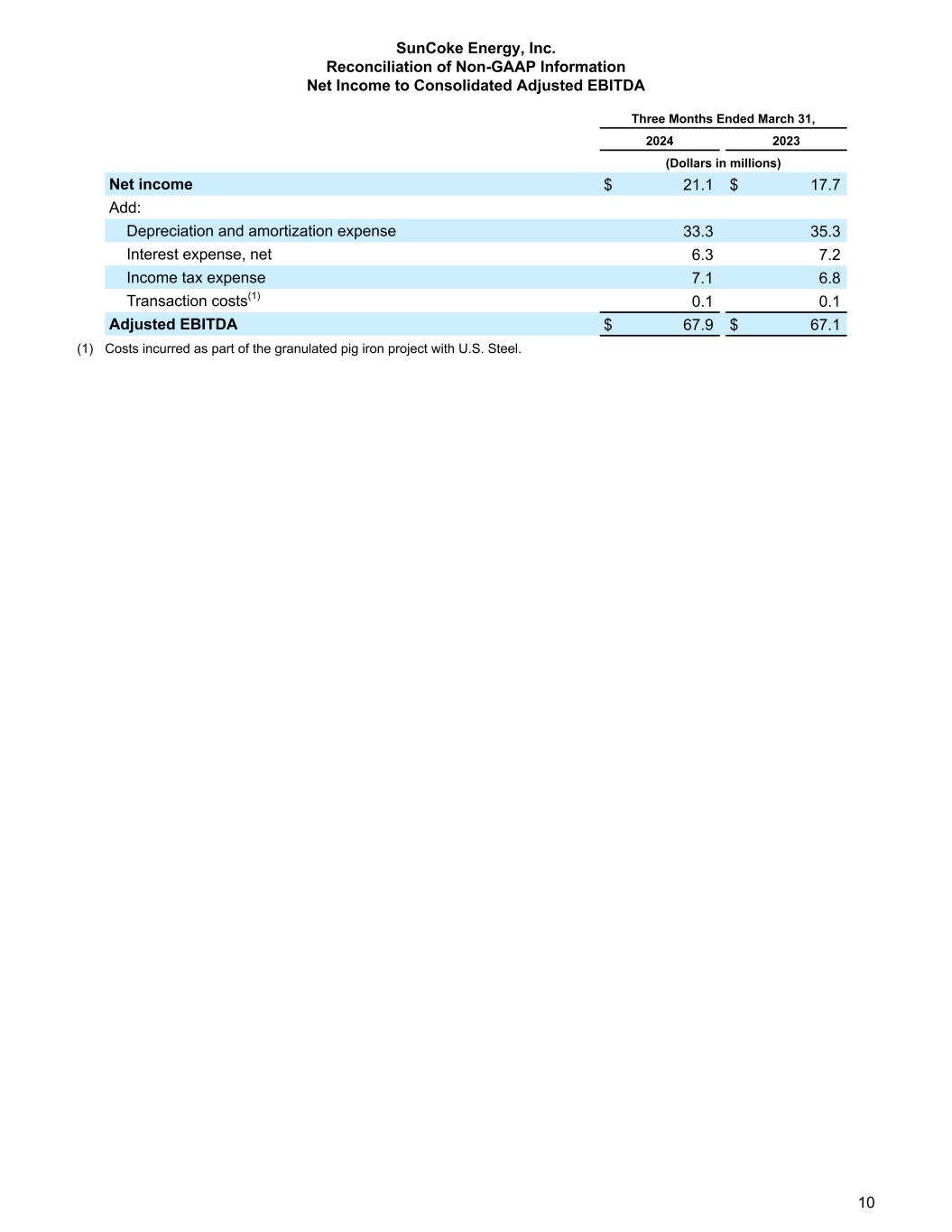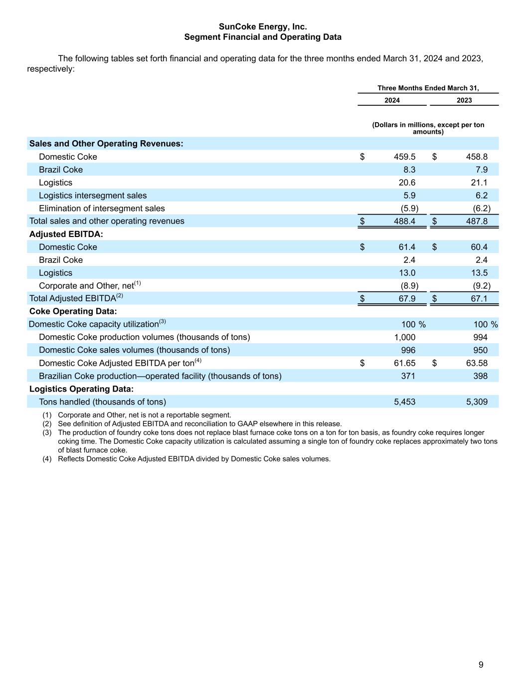 SunCoke Energy, Inc. Segment Financial and Operating Data The following tables set forth financial and operating data for the three months ended March 31, 2024 and 2023, respectively: Three Months Ended March 31, 2024 2023 (Dollars in millions, except per ton amounts) Sales and Other Operating Revenues: Domestic Coke $ 459.5 $ 458.8 Brazil Coke 8.3 7.9 Logistics 20.6 21.1 Logistics intersegment sales 5.9 6.2 Elimination of intersegment sales (5.9) (6.2) Total sales and other operating revenues $ 488.4 $ 487.8 Adjusted EBITDA: Domestic Coke $ 61.4 $ 60.4 Brazil Coke 2.4 2.4 Logistics 13.0 13.5 Corporate and Other, net(1) (8.9) (9.2) Total Adjusted EBITDA(2) $ 67.9 $ 67.1 Coke Operating Data: Domestic Coke capacity utilization(3) 100 % 100 % Domestic Coke production volumes (thousands of tons) 1,000 994 Domestic Coke sales volumes (thousands of tons) 996 950 Domestic Coke Adjusted EBITDA per ton(4) $ 61.65 $ 63.58 Brazilian Coke production—operated facility (thousands of tons) 371 398 Logistics Operating Data: Tons handled (thousands of tons) 5,453 5,309 (1) Corporate and Other, net is not a reportable segment. (2) See definition of Adjusted EBITDA and reconciliation to GAAP elsewhere in this release. (3) The production of foundry coke tons does not replace blast furnace coke tons on a ton for ton basis, as foundry coke requires longer coking time. The Domestic Coke capacity utilization is calculated assuming a single ton of foundry coke replaces approximately two tons of blast furnace coke. (4) Reflects Domestic Coke Adjusted EBITDA divided by Domestic Coke sales volumes. 9