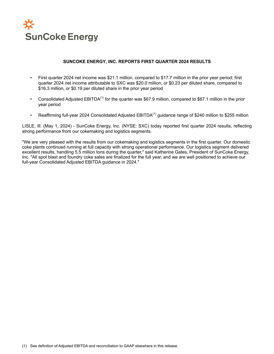 SUNCOKE ENERGY, INC. REPORTS FIRST QUARTER 2024 RESULTS • First quarter 2024 net income was $21.1 million, compared to $17.7 million in the prior year period; first quarter 2024 net income attributable to SXC was $20.0 million, or $0.23 per diluted share, compared to $16.3 million, or $0.19 per diluted share in the prior year period • Consolidated Adjusted EBITDA(1) for the quarter was $67.9 million, compared to $67.1 million in the prior year period • Reaffirming full-year 2024 Consolidated Adjusted EBITDA(1) guidance range of $240 million to $255 million LISLE, Ill. (May 1, 2024) - SunCoke Energy, Inc. (NYSE: SXC) today reported first quarter 2024 results, reflecting strong performance from our cokemaking and logistics segments. "We are very pleased with the results from our cokemaking and logistics segments in the first quarter. Our domestic coke plants continued running at full capacity with strong operational performance. Our logistics segment delivered excellent results, handling 5.5 million tons during the quarter," said Katherine Gates, President of SunCoke Energy, Inc. "All spot blast and foundry coke sales are finalized for the full year, and we are well positioned to achieve our full-year Consolidated Adjusted EBITDA guidance in 2024." (1) See definition of Adjusted EBITDA and reconciliation to GAAP elsewhere in this release.