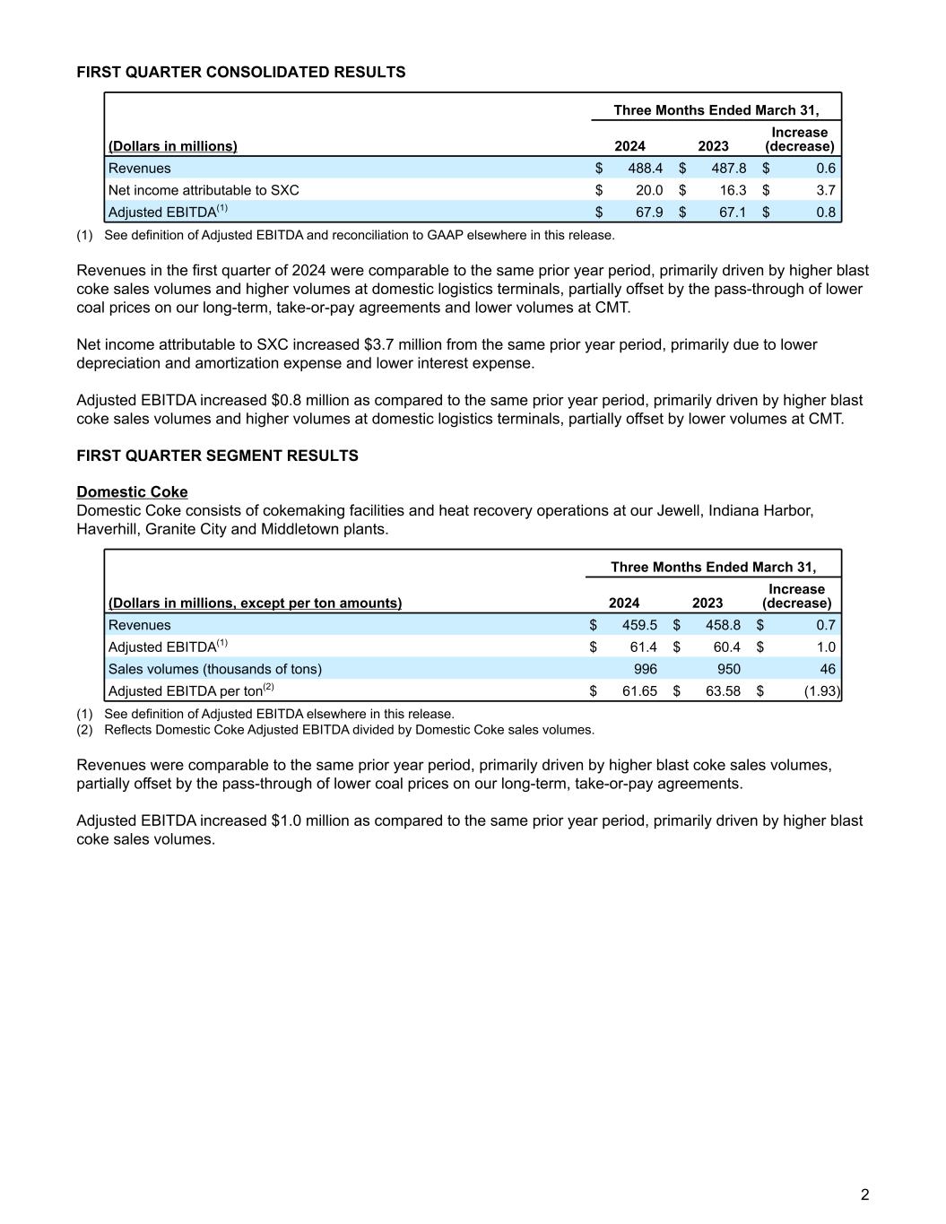 FIRST QUARTER CONSOLIDATED RESULTS Three Months Ended March 31, (Dollars in millions) 2024 2023 Increase (decrease) Revenues $ 488.4 $ 487.8 $ 0.6 Net income attributable to SXC $ 20.0 $ 16.3 $ 3.7 Adjusted EBITDA(1) $ 67.9 $ 67.1 $ 0.8 (1) See definition of Adjusted EBITDA and reconciliation to GAAP elsewhere in this release. Revenues in the first quarter of 2024 were comparable to the same prior year period, primarily driven by higher blast coke sales volumes and higher volumes at domestic logistics terminals, partially offset by the pass-through of lower coal prices on our long-term, take-or-pay agreements and lower volumes at CMT. Net income attributable to SXC increased $3.7 million from the same prior year period, primarily due to lower depreciation and amortization expense and lower interest expense. Adjusted EBITDA increased $0.8 million as compared to the same prior year period, primarily driven by higher blast coke sales volumes and higher volumes at domestic logistics terminals, partially offset by lower volumes at CMT. FIRST QUARTER SEGMENT RESULTS Domestic Coke Domestic Coke consists of cokemaking facilities and heat recovery operations at our Jewell, Indiana Harbor, Haverhill, Granite City and Middletown plants. Three Months Ended March 31, (Dollars in millions, except per ton amounts) 2024 2023 Increase (decrease) Revenues $ 459.5 $ 458.8 $ 0.7 Adjusted EBITDA(1) $ 61.4 $ 60.4 $ 1.0 Sales volumes (thousands of tons) 996 950 46 Adjusted EBITDA per ton(2) $ 61.65 $ 63.58 $ (1.93) (1) See definition of Adjusted EBITDA elsewhere in this release. (2) Reflects Domestic Coke Adjusted EBITDA divided by Domestic Coke sales volumes. Revenues were comparable to the same prior year period, primarily driven by higher blast coke sales volumes, partially offset by the pass-through of lower coal prices on our long-term, take-or-pay agreements. Adjusted EBITDA increased $1.0 million as compared to the same prior year period, primarily driven by higher blast coke sales volumes. 2