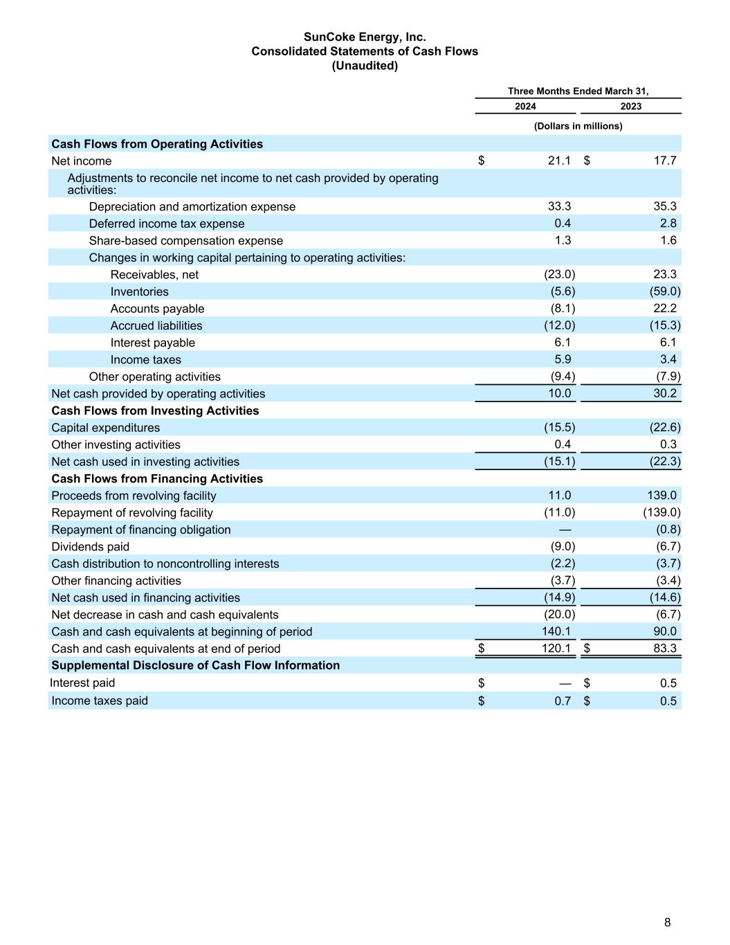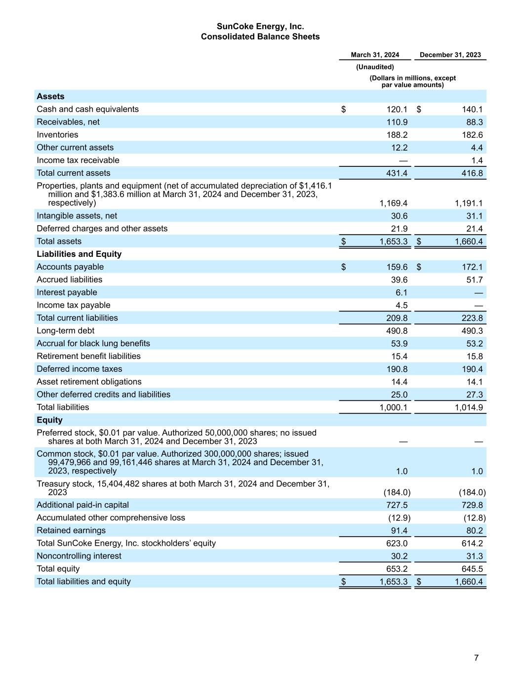 SunCoke Energy, Inc. Consolidated Balance Sheets March 31, 2024 December 31, 2023 (Unaudited) (Dollars in millions, except par value amounts) Assets Cash and cash equivalents $ 120.1 $ 140.1 Receivables, net 110.9 88.3 Inventories 188.2 182.6 Other current assets 12.2 4.4 Income tax receivable — 1.4 Total current assets 431.4 416.8 Properties, plants and equipment (net of accumulated depreciation of $1,416.1 million and $1,383.6 million at March 31, 2024 and December 31, 2023, respectively) 1,169.4 1,191.1 Intangible assets, net 30.6 31.1 Deferred charges and other assets 21.9 21.4 Total assets $ 1,653.3 $ 1,660.4 Liabilities and Equity Accounts payable $ 159.6 $ 172.1 Accrued liabilities 39.6 51.7 Interest payable 6.1 — Income tax payable 4.5 — Total current liabilities 209.8 223.8 Long-term debt 490.8 490.3 Accrual for black lung benefits 53.9 53.2 Retirement benefit liabilities 15.4 15.8 Deferred income taxes 190.8 190.4 Asset retirement obligations 14.4 14.1 Other deferred credits and liabilities 25.0 27.3 Total liabilities 1,000.1 1,014.9 Equity Preferred stock, $0.01 par value. Authorized 50,000,000 shares; no issued shares at both March 31, 2024 and December 31, 2023 — — Common stock, $0.01 par value. Authorized 300,000,000 shares; issued 99,479,966 and 99,161,446 shares at March 31, 2024 and December 31, 2023, respectively 1.0 1.0 Treasury stock, 15,404,482 shares at both March 31, 2024 and December 31, 2023 (184.0) (184.0) Additional paid-in capital 727.5 729.8 Accumulated other comprehensive loss (12.9) (12.8) Retained earnings 91.4 80.2 Total SunCoke Energy, Inc. stockholders’ equity 623.0 614.2 Noncontrolling interest 30.2 31.3 Total equity 653.2 645.5 Total liabilities and equity $ 1,653.3 $ 1,660.4 7