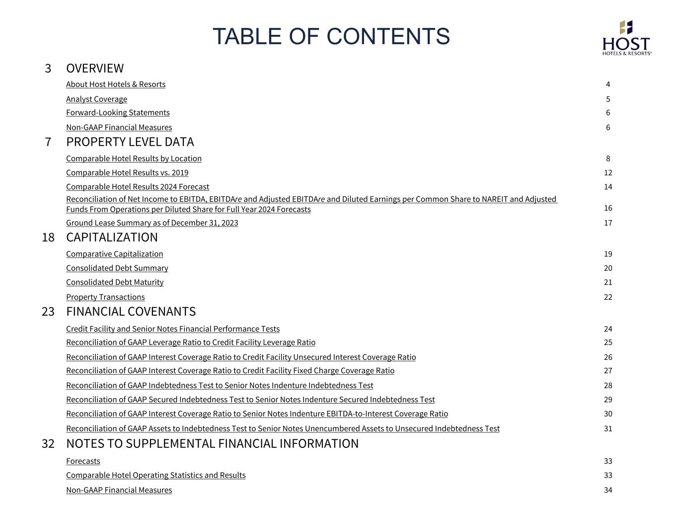 TABLE OF CONTENTS The Phoenician, a luxury collection resort PROPERTY LEVEL DATA CAPITALIZATION FINANCIAL COVENANTS NOTES TO SUPPLEMENTAL INFORMATION 3 OVERVIEW About Host Hotels & Resorts 4 Analyst Coverage 5 Forward-Looking Statements 6 Non-GAAP Financial Measures 6 7 PROPERTY LEVEL DATA Comparable Hotel Results by Location 8 Comparable Hotel Results vs. 2019 12 Comparable Hotel Results 2024 Forecast 14 Reconciliation of Net Income to EBITDA, EBITDAre and Adjusted EBITDAre and Diluted Earnings per Common Share to NAREIT and Adjusted Funds From Operations per Diluted Share for Full Year 2024 Forecasts 16 Ground Lease Summary as of December 31, 2023 17 18 CAPITALIZATION Comparative Capitalization 19 Consolidated Debt Summary 20 Consolidated Debt Maturity 21 Property Transactions 22 23 FINANCIAL COVENANTS Credit Facility and Senior Notes Financial Performance Tests 24 Reconciliation of GAAP Leverage Ratio to Credit Facility Leverage Ratio 25 Reconciliation of GAAP Interest Coverage Ratio to Credit Facility Unsecured Interest Coverage Ratio 26 Reconciliation of GAAP Interest Coverage Ratio to Credit Facility Fixed Charge Coverage Ratio 27 Reconciliation of GAAP Indebtedness Test to Senior Notes Indenture Indebtedness Test 28 Reconciliation of GAAP Secured Indebtedness Test to Senior Notes Indenture Secured Indebtedness Test 29 Reconciliation of GAAP Interest Coverage Ratio to Senior Notes Indenture EBITDA-to-Interest Coverage Ratio 30 Reconciliation of GAAP Assets to Indebtedness Test to Senior Notes Unencumbered Assets to Unsecured Indebtedness Test 31 32 NOTES TO SUPPLEMENTAL FINANCIAL INFORMATION Forecasts 33 Comparable Hotel Operating Statistics and Results 33 Non-GAAP Financial Measures 34