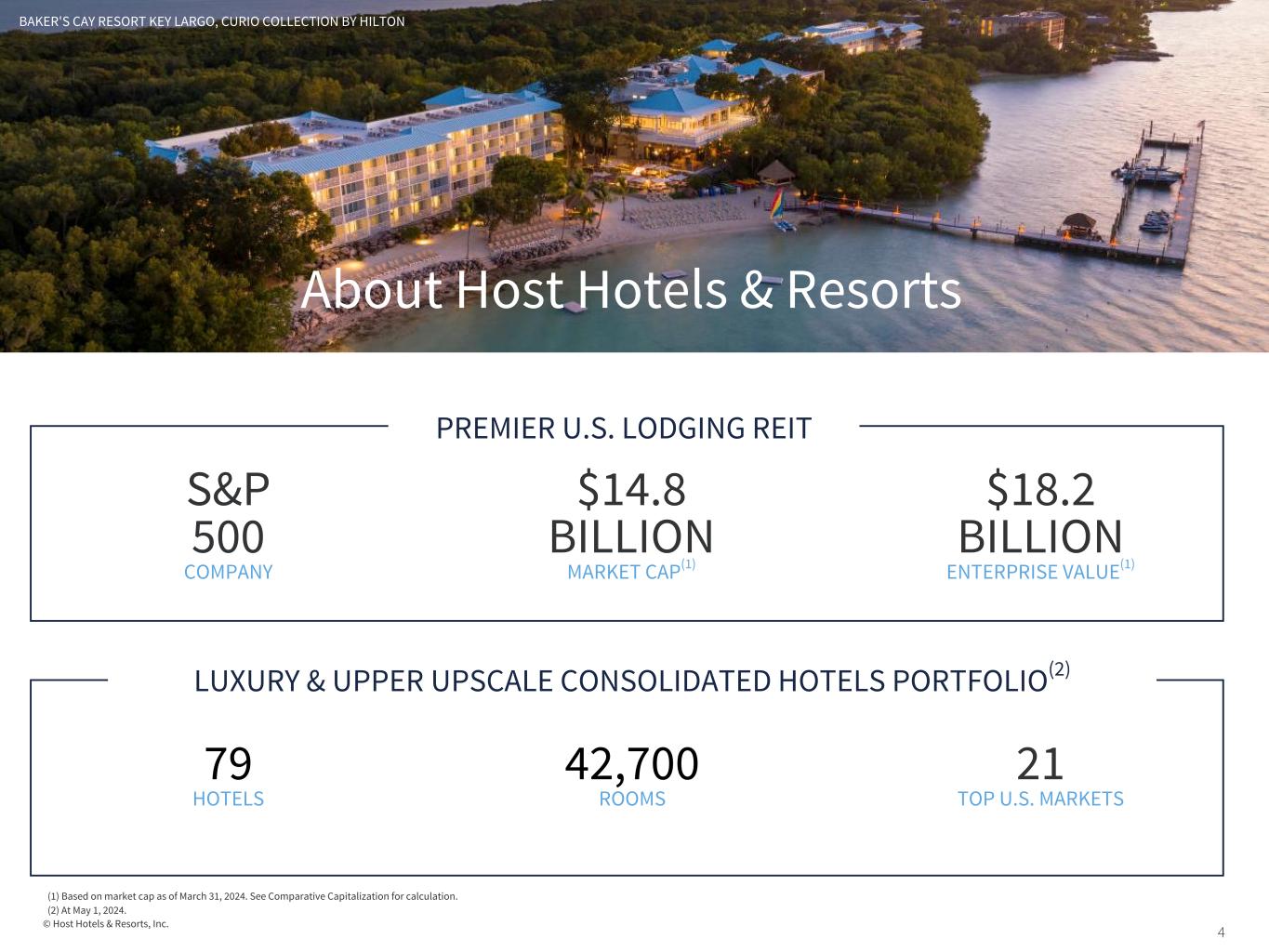 6© Host Hotels & Resorts, Inc. ABOUT HOST HOTELS & RESORTS Host Hotels & Resorts, Inc., herein referred to as “we,” “Host Inc.,” or the “Company,” is a self-managed and self-administered real estate investment trust that owns hotel properties. We conduct our operations as an umbrella partnership REIT through an operating partnership, Host Hotels & Resorts, L.P. (“Host LP”), of which we are the sole general partner. When distinguishing between Host Inc. and Host LP, the primary difference is approximately 1% of the partnership interests in Host LP held by outside partners as of March 31, 2024, which are non-controlling interests in Host LP in our consolidated balance sheets and are included in net (income) loss attributable to non-controlling interests in our condensed consolidated statements of operations. Readers are encouraged to find further detail regarding our organizational structure in our annual report on Form 10-K. FORWARD-LOOKING STATEMENTS This supplemental information contains forward-looking statements within the meaning of federal securities regulations. These forward-looking statements which include, but may not be limited to, our expectations regarding the recovery of travel and the lodging industry, the impact of the Maui wildfires and 2024 estimates with respect to our business, including our anticipated capital expenditures and financial and operating results. Forward-looking statements are not guarantees of future performance and involve known and unknown risks, uncertainties and other factors which may cause the actual results to differ materially from those anticipated at the time the forward-looking statements are made. These risks include, but are not limited to, those described in the Company's annual report on Form 10-K and other filings with the SEC. Although the Company believes the expectations reflected in such forward-looking statements are based upon reasonable assumptions, it can give no assurance that the expectations will be attained or that any deviation will not be material. All information in this supplemental presentation is as of May 1, 2024, and the Company undertakes no obligation to update any forward-looking statement to conform the statement to actual results or changes in the Company’s expectations. NON-GAAP FINANCIAL MEASURES Included in this supplemental information are certain “non-GAAP financial measures,” which are measures of our historical or future financial performance that are not calculated and presented in accordance with GAAP (U.S. generally accepted accounting principles), within the meaning of applicable SEC rules. They are as follows: : (i) Funds From Operations (“FFO”) and FFO per diluted share (both NAREIT and Adjusted), (ii) EBITDA (for both the Company and hotel level), (iii) EBITDAre and Adjusted EBITDAre, and (iv) Comparable Hotel Operating Statistics and Results. Also included are reconciliations to the most directly comparable GAAP measures. See the Notes to Supplemental Financial Information for definitions of these measures, why we believe these measures are useful and limitations on their use. Also included in this supplemental information is our leverage ratio, unsecured interest coverage ratio and fixed charge coverage ratio, calculated in accordance with our credit facility, along with our EBITDA to interest coverage ratio, indenture indebtedness test, indenture secured indebtedness test, and indenture unencumbered assets to unsecured indebtedness test, calculated in accordance with our senior notes indenture covenants. Included with these ratios are reconciliations calculated in accordance with GAAP. See the Notes to Supplemental Financial Information for information on how these supplemental measures are calculated, why we believe they are useful and limitations on their use. Overview