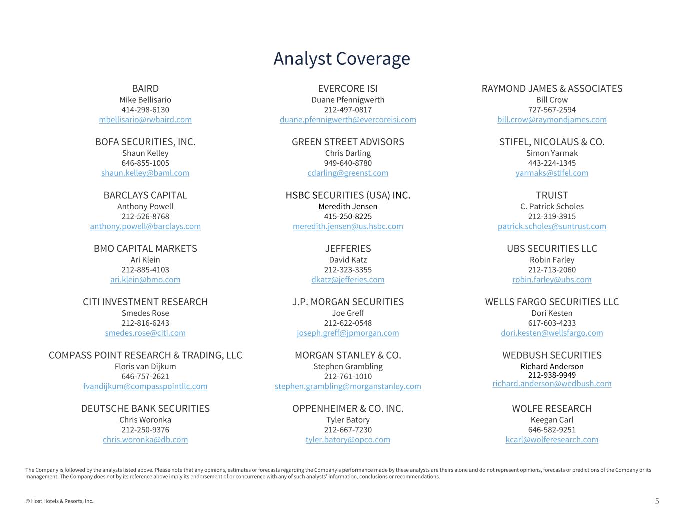 5© Host Hotels & Resorts, Inc. BAIRD Mike Bellisario 414-298-6130 mbellisario@rwbaird.com EVERCORE ISI Duane Pfennigwerth 212-497-0817 duane.pfennigwerth@evercoreisi.com RAYMOND JAMES & ASSOCIATES Bill Crow 727-567-2594 bill.crow@raymondjames.com BOFA SECURITIES, INC. Shaun Kelley 646-855-1005 shaun.kelley@baml.com GREEN STREET ADVISORS Chris Darling 949-640-8780 cdarling@greenst.com STIFEL, NICOLAUS & CO. Simon Yarmak 443-224-1345 yarmaks@stifel.com BARCLAYS CAPITAL Anthony Powell 212-526-8768 anthony.powell@barclays.com HSBC SECURITIES (USA) INC. Meredith Jensen 415-250-8225 meredith.jensen@us.hsbc.com TRUIST C. Patrick Scholes 212-319-3915 patrick.scholes@suntrust.com BMO CAPITAL MARKETS Ari Klein 212-885-4103 ari.klein@bmo.com JEFFERIES David Katz 212-323-3355 dkatz@jefferies.com UBS SECURITIES LLC Robin Farley 212-713-2060 robin.farley@ubs.com CITI INVESTMENT RESEARCH Smedes Rose 212-816-6243 smedes.rose@citi.com J.P. MORGAN SECURITIES Joe Greff 212-622-0548 joseph.greff@jpmorgan.com WELLS FARGO SECURITIES LLC Dori Kesten 617-603-4233 dori.kesten@wellsfargo.com COMPASS POINT RESEARCH & TRADING, LLC Floris van Dijkum 646-757-2621 fvandijkum@compasspointllc.com MORGAN STANLEY & CO. Stephen Grambling 212-761-1010 stephen.grambling@morganstanley.com WEDBUSH SECURITIES Richard Anderson 212-938-9949 richard.anderson@wedbush.com DEUTSCHE BANK SECURITIES Chris Woronka 212-250-9376 chris.woronka@db.com OPPENHEIMER & CO. INC. Tyler Batory 212-667-7230 tyler.batory@opco.com WOLFE RESEARCH Keegan Carl 646-582-9251 kcarl@wolferesearch.com Analyst Coverage The Company is followed by the analysts listed above. Please note that any opinions, estimates or forecasts regarding the Company’s performance made by these analysts are theirs alone and do not represent opinions, forecasts or predictions of the Company or its management. The Company does not by its reference above imply its endorsement of or concurrence with any of such analysts’ information, conclusions or recommendations.