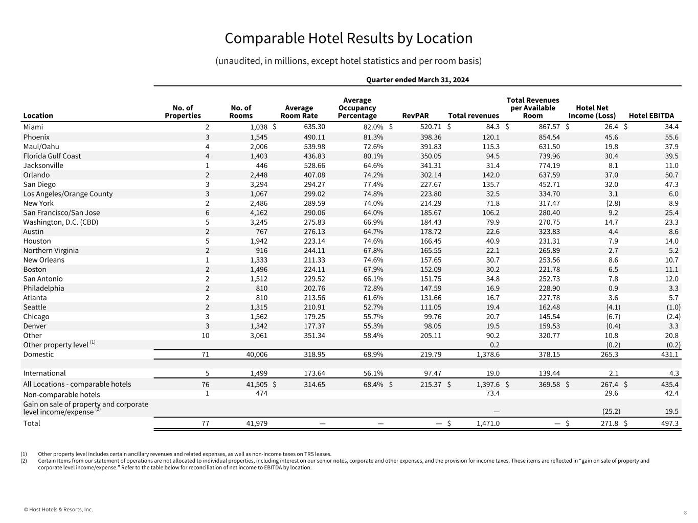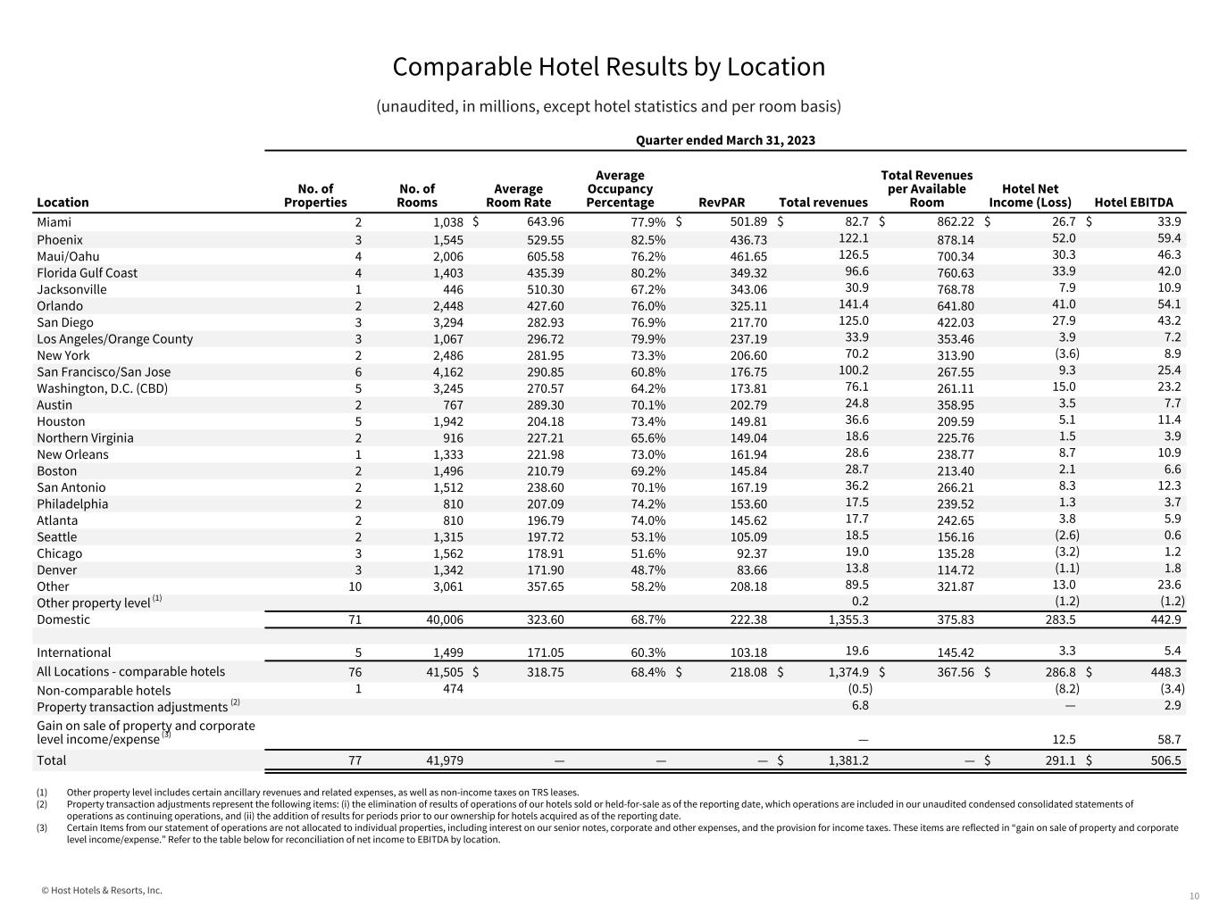 © Host Hotels & Resorts, Inc. Comparable Hotel Results by Location (unaudited, in millions, except hotel statistics and per room basis) 9 Quarter ended March 31, 2024 Location No. of Properties No. of Rooms Hotel Net Income (Loss) Plus: Depreciation Plus: Interest Expense Plus: Income Tax Equals: Hotel EBITDA Miami 2 1,038 $ 26.4 $ 8.0 $ — $ — $ 34.4 Phoenix 3 1,545 45.6 10.0 — — 55.6 Maui/Oahu 4 2,006 19.8 18.1 — — 37.9 Florida Gulf Coast 4 1,403 30.4 9.1 — — 39.5 Jacksonville 1 446 8.1 2.9 — — 11.0 Orlando 2 2,448 37.0 13.7 — — 50.7 San Diego 3 3,294 32.0 15.3 — — 47.3 Los Angeles/Orange County 3 1,067 3.1 2.9 — — 6.0 New York 2 2,486 (2.8) 11.7 — — 8.9 San Francisco/San Jose 6 4,162 9.2 16.2 — — 25.4 Washington, D.C. (CBD) 5 3,245 14.7 8.6 — — 23.3 Austin 2 767 4.4 3.2 1.0 — 8.6 Houston 5 1,942 7.9 6.1 — — 14.0 Northern Virginia 2 916 2.7 2.5 — — 5.2 New Orleans 1 1,333 8.6 2.1 — — 10.7 Boston 2 1,496 6.5 4.6 — — 11.1 San Antonio 2 1,512 7.8 4.2 — — 12.0 Philadelphia 2 810 0.9 2.4 — — 3.3 Atlanta 2 810 3.6 2.1 — — 5.7 Seattle 2 1,315 (4.1) 3.1 — — (1.0) Chicago 3 1,562 (6.7) 4.3 — — (2.4) Denver 3 1,342 (0.4) 3.7 — — 3.3 Other 10 3,061 10.8 10.0 — — 20.8 Other property level (1) (0.2) — — — (0.2) Domestic 71 40,006 265.3 164.8 1.0 — 431.1 International 5 1,499 2.1 2.2 — — 4.3 All Locations - comparable hotels 76 41,505 $ 267.4 $ 167.0 $ 1.0 $ — $ 435.4 Non-comparable hotels 1 474 29.6 12.8 — — 42.4 Gain on sale of property and corporate level income/expense (2) (25.2) 0.2 46.2 (1.7) 19.5 Total 77 41,979 $ 271.8 $ 180.0 $ 47.2 $ (1.7) $ 497.3 (1) Other property level includes certain ancillary revenues and related expenses, as well as non-income taxes on TRS leases. (2) Certain Items from our statement of operations are not allocated to individual properties, including interest on our senior notes, corporate and other expenses, and the provision for income taxes. These items are reflected in “gain on sale of property and corporate level income/expense."