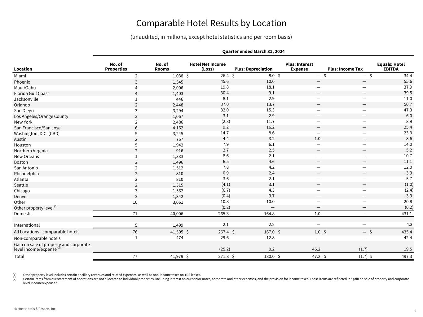© Host Hotels & Resorts, Inc. Comparable Hotel Results by Location (unaudited, in millions, except hotel statistics and per room basis) 8 Quarter ended March 31, 2024 Location No. of Properties No. of Rooms Average Room Rate Average Occupancy Percentage RevPAR Total revenues Total Revenues per Available Room Hotel Net Income (Loss) Hotel EBITDA Miami 2 1,038 $ 635.30 82.0% $ 520.71 $ 84.3 $ 867.57 $ 26.4 $ 34.4 Phoenix 3 1,545 490.11 81.3% 398.36 120.1 854.54 45.6 55.6 Maui/Oahu 4 2,006 539.98 72.6% 391.83 115.3 631.50 19.8 37.9 Florida Gulf Coast 4 1,403 436.83 80.1% 350.05 94.5 739.96 30.4 39.5 Jacksonville 1 446 528.66 64.6% 341.31 31.4 774.19 8.1 11.0 Orlando 2 2,448 407.08 74.2% 302.14 142.0 637.59 37.0 50.7 San Diego 3 3,294 294.27 77.4% 227.67 135.7 452.71 32.0 47.3 Los Angeles/Orange County 3 1,067 299.02 74.8% 223.80 32.5 334.70 3.1 6.0 New York 2 2,486 289.59 74.0% 214.29 71.8 317.47 (2.8) 8.9 San Francisco/San Jose 6 4,162 290.06 64.0% 185.67 106.2 280.40 9.2 25.4 Washington, D.C. (CBD) 5 3,245 275.83 66.9% 184.43 79.9 270.75 14.7 23.3 Austin 2 767 276.13 64.7% 178.72 22.6 323.83 4.4 8.6 Houston 5 1,942 223.14 74.6% 166.45 40.9 231.31 7.9 14.0 Northern Virginia 2 916 244.11 67.8% 165.55 22.1 265.89 2.7 5.2 New Orleans 1 1,333 211.33 74.6% 157.65 30.7 253.56 8.6 10.7 Boston 2 1,496 224.11 67.9% 152.09 30.2 221.78 6.5 11.1 San Antonio 2 1,512 229.52 66.1% 151.75 34.8 252.73 7.8 12.0 Philadelphia 2 810 202.76 72.8% 147.59 16.9 228.90 0.9 3.3 Atlanta 2 810 213.56 61.6% 131.66 16.7 227.78 3.6 5.7 Seattle 2 1,315 210.91 52.7% 111.05 19.4 162.48 (4.1) (1.0) Chicago 3 1,562 179.25 55.7% 99.76 20.7 145.54 (6.7) (2.4) Denver 3 1,342 177.37 55.3% 98.05 19.5 159.53 (0.4) 3.3 Other 10 3,061 351.34 58.4% 205.11 90.2 320.77 10.8 20.8 Other property level (1) 0.2 (0.2) (0.2) Domestic 71 40,006 318.95 68.9% 219.79 1,378.6 378.15 265.3 431.1 International 5 1,499 173.64 56.1% 97.47 19.0 139.44 2.1 4.3 All Locations - comparable hotels 76 41,505 $ 314.65 68.4% $ 215.37 $ 1,397.6 $ 369.58 $ 267.4 $ 435.4 Non-comparable hotels 1 474 73.4 29.6 42.4 Gain on sale of property and corporate level income/expense (2) — (25.2) 19.5 Total 77 41,979 — — — $ 1,471.0 — $ 271.8 $ 497.3 (1) Other property level includes certain ancillary revenues and related expenses, as well as non-income taxes on TRS leases. (2) Certain Items from our statement of operations are not allocated to individual properties, including interest on our senior notes, corporate and other expenses, and the provision for income taxes. These items are reflected in “gain on sale of property and corporate level income/expense.” Refer to the table below for reconciliation of net income to EBITDA by location.