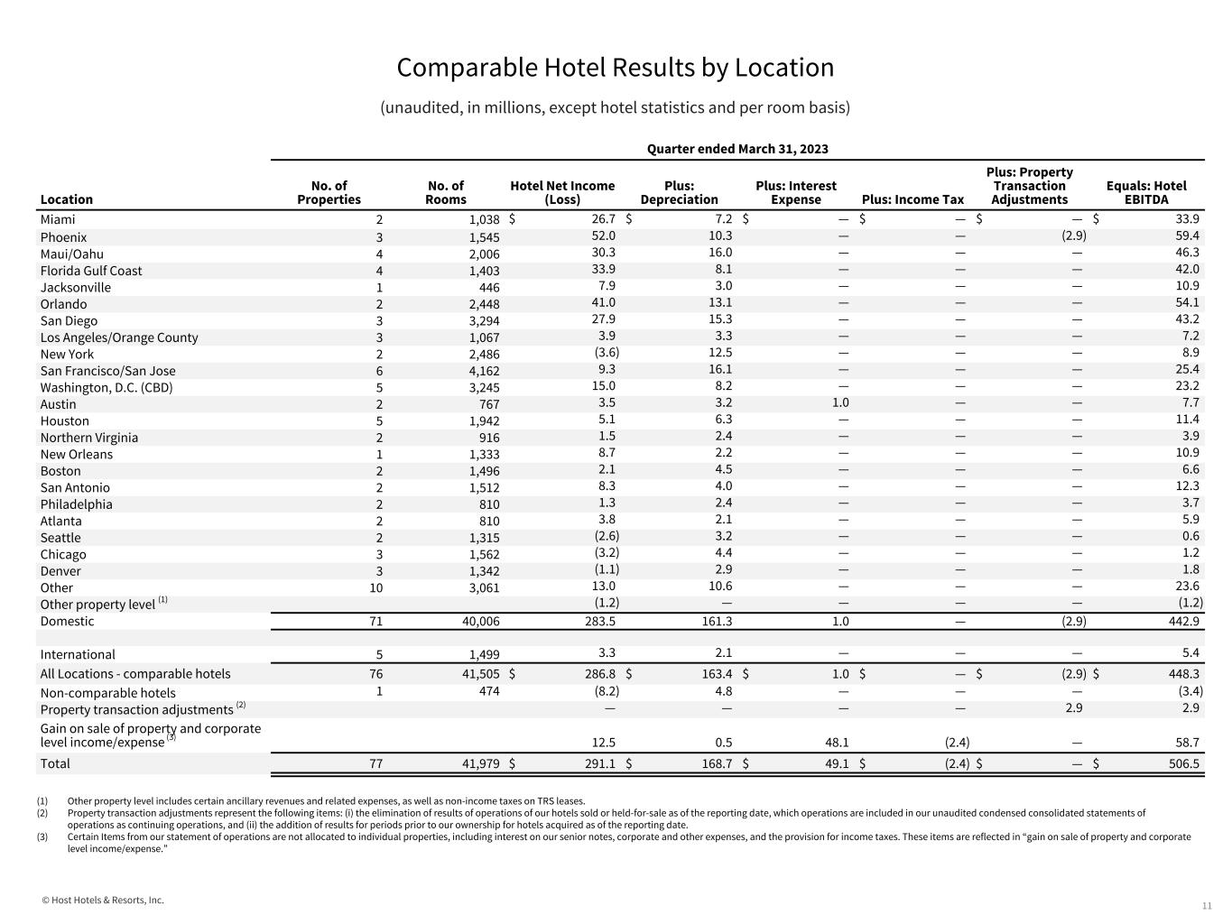© Host Hotels & Resorts, Inc. Comparable Hotel Results by Location (unaudited, in millions, except hotel statistics and per room basis) 10 Quarter ended March 31, 2023 Location No. of Properties No. of Rooms Average Room Rate Average Occupancy Percentage RevPAR Total revenues Total Revenues per Available Room Hotel Net Income (Loss) Hotel EBITDA Miami 2 1,038 $ 643.96 77.9% $ 501.89 $ 82.7 $ 862.22 $ 26.7 $ 33.9 Phoenix 3 1,545 529.55 82.5% 436.73 122.1 878.14 52.0 59.4 Maui/Oahu 4 2,006 605.58 76.2% 461.65 126.5 700.34 30.3 46.3 Florida Gulf Coast 4 1,403 435.39 80.2% 349.32 96.6 760.63 33.9 42.0 Jacksonville 1 446 510.30 67.2% 343.06 30.9 768.78 7.9 10.9 Orlando 2 2,448 427.60 76.0% 325.11 141.4 641.80 41.0 54.1 San Diego 3 3,294 282.93 76.9% 217.70 125.0 422.03 27.9 43.2 Los Angeles/Orange County 3 1,067 296.72 79.9% 237.19 33.9 353.46 3.9 7.2 New York 2 2,486 281.95 73.3% 206.60 70.2 313.90 (3.6) 8.9 San Francisco/San Jose 6 4,162 290.85 60.8% 176.75 100.2 267.55 9.3 25.4 Washington, D.C. (CBD) 5 3,245 270.57 64.2% 173.81 76.1 261.11 15.0 23.2 Austin 2 767 289.30 70.1% 202.79 24.8 358.95 3.5 7.7 Houston 5 1,942 204.18 73.4% 149.81 36.6 209.59 5.1 11.4 Northern Virginia 2 916 227.21 65.6% 149.04 18.6 225.76 1.5 3.9 New Orleans 1 1,333 221.98 73.0% 161.94 28.6 238.77 8.7 10.9 Boston 2 1,496 210.79 69.2% 145.84 28.7 213.40 2.1 6.6 San Antonio 2 1,512 238.60 70.1% 167.19 36.2 266.21 8.3 12.3 Philadelphia 2 810 207.09 74.2% 153.60 17.5 239.52 1.3 3.7 Atlanta 2 810 196.79 74.0% 145.62 17.7 242.65 3.8 5.9 Seattle 2 1,315 197.72 53.1% 105.09 18.5 156.16 (2.6) 0.6 Chicago 3 1,562 178.91 51.6% 92.37 19.0 135.28 (3.2) 1.2 Denver 3 1,342 171.90 48.7% 83.66 13.8 114.72 (1.1) 1.8 Other 10 3,061 357.65 58.2% 208.18 89.5 321.87 13.0 23.6 Other property level (1) 0.2 (1.2) (1.2) Domestic 71 40,006 323.60 68.7% 222.38 1,355.3 375.83 283.5 442.9 International 5 1,499 171.05 60.3% 103.18 19.6 145.42 3.3 5.4 All Locations - comparable hotels 76 41,505 $ 318.75 68.4% $ 218.08 $ 1,374.9 $ 367.56 $ 286.8 $ 448.3 Non-comparable hotels 1 474 (0.5) (8.2) (3.4) Property transaction adjustments (2) 6.8 — 2.9 Gain on sale of property and corporate level income/expense (3) — 12.5 58.7 Total 77 41,979 — — — $ 1,381.2 — $ 291.1 $ 506.5 (1) Other property level includes certain ancillary revenues and related expenses, as well as non-income taxes on TRS leases. (2) Property transaction adjustments represent the following items: (i) the elimination of results of operations of our hotels sold or held-for-sale as of the reporting date, which operations are included in our unaudited condensed consolidated statements of operations as continuing operations, and (ii) the addition of results for periods prior to our ownership for hotels acquired as of the reporting date. (3) Certain Items from our statement of operations are not allocated to individual properties, including interest on our senior notes, corporate and other expenses, and the provision for income taxes. These items are reflected in “gain on sale of property and corporate level income/expense.” Refer to the table below for reconciliation of net income to EBITDA by location.
