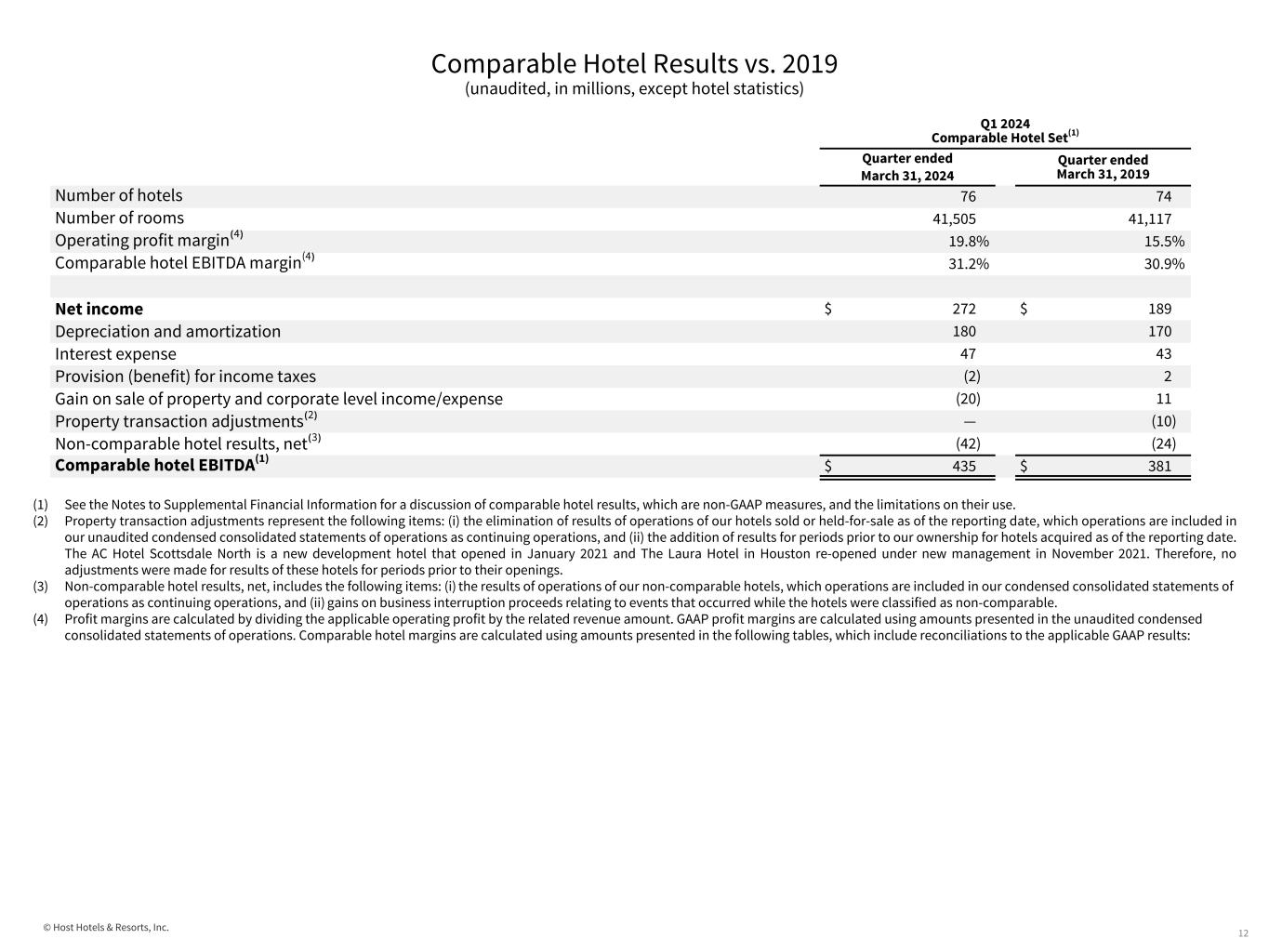 © Host Hotels & Resorts, Inc. Quarter ended March 31, 2023 Location No. of Properties No. of Rooms Hotel Net Income (Loss) Plus: Depreciation Plus: Interest Expense Plus: Income Tax Plus: Property Transaction Adjustments Equals: Hotel EBITDA Miami 2 1,038 $ 26.7 $ 7.2 $ — $ — $ — $ 33.9 Phoenix 3 1,545 52.0 10.3 — — (2.9) 59.4 Maui/Oahu 4 2,006 30.3 16.0 — — — 46.3 Florida Gulf Coast 4 1,403 33.9 8.1 — — — 42.0 Jacksonville 1 446 7.9 3.0 — — — 10.9 Orlando 2 2,448 41.0 13.1 — — — 54.1 San Diego 3 3,294 27.9 15.3 — — — 43.2 Los Angeles/Orange County 3 1,067 3.9 3.3 — — — 7.2 New York 2 2,486 (3.6) 12.5 — — — 8.9 San Francisco/San Jose 6 4,162 9.3 16.1 — — — 25.4 Washington, D.C. (CBD) 5 3,245 15.0 8.2 — — — 23.2 Austin 2 767 3.5 3.2 1.0 — — 7.7 Houston 5 1,942 5.1 6.3 — — — 11.4 Northern Virginia 2 916 1.5 2.4 — — — 3.9 New Orleans 1 1,333 8.7 2.2 — — — 10.9 Boston 2 1,496 2.1 4.5 — — — 6.6 San Antonio 2 1,512 8.3 4.0 — — — 12.3 Philadelphia 2 810 1.3 2.4 — — — 3.7 Atlanta 2 810 3.8 2.1 — — — 5.9 Seattle 2 1,315 (2.6) 3.2 — — — 0.6 Chicago 3 1,562 (3.2) 4.4 — — — 1.2 Denver 3 1,342 (1.1) 2.9 — — — 1.8 Other 10 3,061 13.0 10.6 — — — 23.6 Other property level (1) (1.2) — — — — (1.2) Domestic 71 40,006 283.5 161.3 1.0 — (2.9) 442.9 International 5 1,499 3.3 2.1 — — — 5.4 All Locations - comparable hotels 76 41,505 $ 286.8 $ 163.4 $ 1.0 $ — $ (2.9) $ 448.3 Non-comparable hotels 1 474 (8.2) 4.8 — — — (3.4) Property transaction adjustments (2) — — — — 2.9 2.9 Gain on sale of property and corporate level income/expense (3) 12.5 0.5 48.1 (2.4) — 58.7 Total 77 41,979 $ 291.1 $ 168.7 $ 49.1 $ (2.4) $ — $ 506.5 Comparable Hotel Results by Location (unaudited, in millions, except hotel statistics and per room basis) 11 (1) Other property level includes certain ancillary revenues and related expenses, as well as non-income taxes on TRS leases. (2) Property transaction adjustments represent the following items: (i) the elimination of results of operations of our hotels sold or held-for-sale as of the reporting date, which operations are included in our unaudited condensed consolidated statements of operations as continuing operations, and (ii) the addition of results for periods prior to our ownership for hotels acquired as of the reporting date. (3) Certain Items from our statement of operations are not allocated to individual properties, including interest on our senior notes, corporate and other expenses, and the provision for income taxes. These items are reflected in “gain on sale of property and corporate level income/expense.”