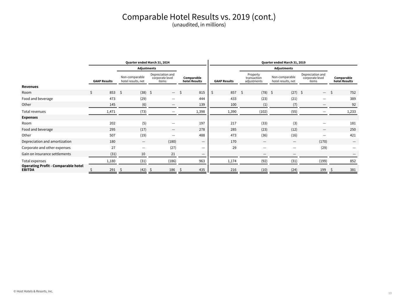 © Host Hotels & Resorts, Inc. Comparable Hotel Results vs. 2019 (unaudited, in millions, except hotel statistics) 12 (1) See the Notes to Supplemental Financial Information for a discussion of comparable hotel results, which are non-GAAP measures, and the limitations on their use. (2) Property transaction adjustments represent the following items: (i) the elimination of results of operations of our hotels sold or held-for-sale as of the reporting date, which operations are included in our unaudited condensed consolidated statements of operations as continuing operations, and (ii) the addition of results for periods prior to our ownership for hotels acquired as of the reporting date. The AC Hotel Scottsdale North is a new development hotel that opened in January 2021 and The Laura Hotel in Houston re-opened under new management in November 2021. Therefore, no adjustments were made for results of these hotels for periods prior to their openings. (3) Non-comparable hotel results, net, includes the following items: (i) the results of operations of our non-comparable hotels, which operations are included in our condensed consolidated statements of operations as continuing operations, and (ii) gains on business interruption proceeds relating to events that occurred while the hotels were classified as non-comparable. (4) Profit margins are calculated by dividing the applicable operating profit by the related revenue amount. GAAP profit margins are calculated using amounts presented in the unaudited condensed consolidated statements of operations. Comparable hotel margins are calculated using amounts presented in the following tables, which include reconciliations to the applicable GAAP results: Q1 2024 Comparable Hotel Set(1) Quarter ended March 31, 2024 Quarter ended March 31, 2019 Number of hotels 76 74 Number of rooms 41,505 41,117 Operating profit margin⁽4⁾ 19.8% 15.5% Comparable hotel EBITDA margin(4⁾ 31.2% 30.9% Net income $ 272 $ 189 Depreciation and amortization 180 170 Interest expense 47 43 Provision (benefit) for income taxes (2) 2 Gain on sale of property and corporate level income/expense (20) 11 Property transaction adjustments⁽2⁾ — (10) Non-comparable hotel results, net⁽3⁾ (42) (24) Comparable hotel EBITDA(1) $ 435 $ 381