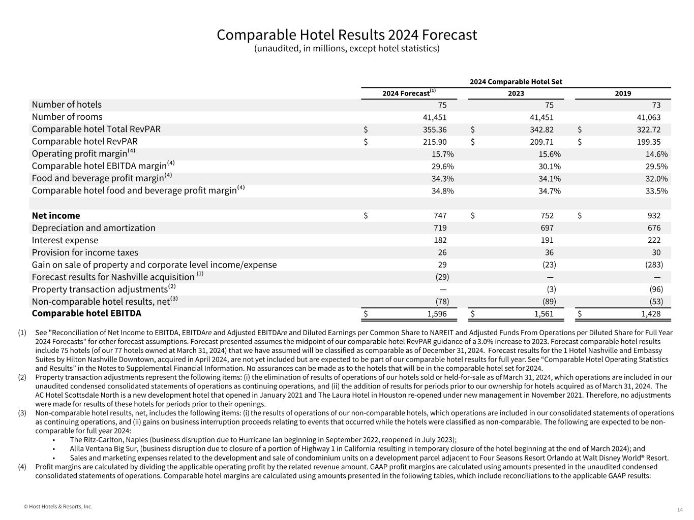 © Host Hotels & Resorts, Inc. Comparable Hotel Results vs. 2019 (cont.) (unaudited, in millions) 13 Quarter ended March 31, 2024 Quarter ended March 31, 2019 Adjustments Adjustments GAAP Results Non-comparable hotel results, net Depreciation and corporate level items Comparable hotel Results GAAP Results Property transaction adjustments Non-comparable hotel results, net Depreciation and corporate level items Comparable hotel Results Revenues Room $ 853 $ (38) $ — $ 815 $ 857 $ (78) $ (27) $ — $ 752 Food and beverage 473 (29) — 444 433 (23) (21) — 389 Other 145 (6) — 139 100 (1) (7) — 92 Total revenues 1,471 (73) — 1,398 1,390 (102) (55) — 1,233 Expenses Room 202 (5) — 197 217 (33) (3) — 181 Food and beverage 295 (17) — 278 285 (23) (12) — 250 Other 507 (19) — 488 473 (36) (16) — 421 Depreciation and amortization 180 — (180) — 170 — — (170) — Corporate and other expenses 27 — (27) — 29 — — (29) — Gain on insurance settlements (31) 10 21 — — — — Total expenses 1,180 (31) (186) 963 1,174 (92) (31) (199) 852 Operating Profit - Comparable hotel EBITDA $ 291 $ (42) $ 186 $ 435 216 (10) (24) 199 $ 381