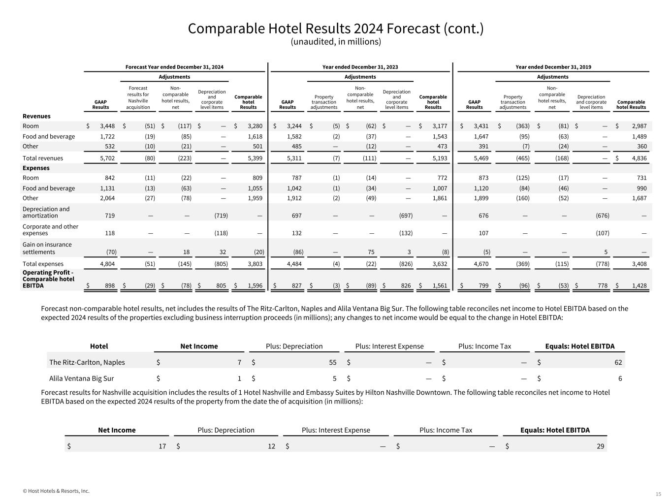© Host Hotels & Resorts, Inc. Comparable Hotel Results 2024 Forecast (unaudited, in millions, except hotel statistics) 14 (1) See "Reconciliation of Net Income to EBITDA, EBITDAre and Adjusted EBITDAre and Diluted Earnings per Common Share to NAREIT and Adjusted Funds From Operations per Diluted Share for Full Year 2024 Forecasts" for other forecast assumptions. Forecast presented assumes the midpoint of our comparable hotel RevPAR guidance of a 3.0% increase to 2023. Forecast comparable hotel results include 75 hotels (of our 77 hotels owned at March 31, 2024) that we have assumed will be classified as comparable as of December 31, 2024. Forecast results for the 1 Hotel Nashville and Embassy Suites by Hilton Nashville Downtown, acquired in April 2024, are not yet included but are expected to be part of our comparable hotel results for full year. See “Comparable Hotel Operating Statistics and Results” in the Notes to Supplemental Financial Information. No assurances can be made as to the hotels that will be in the comparable hotel set for 2024. (2) Property transaction adjustments represent the following items: (i) the elimination of results of operations of our hotels sold or held-for-sale as of March 31, 2024, which operations are included in our unaudited condensed consolidated statements of operations as continuing operations, and (ii) the addition of results for periods prior to our ownership for hotels acquired as of March 31, 2024. The AC Hotel Scottsdale North is a new development hotel that opened in January 2021 and The Laura Hotel in Houston re-opened under new management in November 2021. Therefore, no adjustments were made for results of these hotels for periods prior to their openings. (3) Non-comparable hotel results, net, includes the following items: (i) the results of operations of our non-comparable hotels, which operations are included in our consolidated statements of operations as continuing operations, and (ii) gains on business interruption proceeds relating to events that occurred while the hotels were classified as non-comparable. The following are expected to be non- comparable for full year 2024: • The Ritz-Carlton, Naples (business disruption due to Hurricane Ian beginning in September 2022, reopened in July 2023); • Alila Ventana Big Sur, (business disruption due to closure of a portion of Highway 1 in California resulting in temporary closure of the hotel beginning at the end of March 2024); and • Sales and marketing expenses related to the development and sale of condominium units on a development parcel adjacent to Four Seasons Resort Orlando at Walt Disney World® Resort. (4) Profit margins are calculated by dividing the applicable operating profit by the related revenue amount. GAAP profit margins are calculated using amounts presented in the unaudited condensed consolidated statements of operations. Comparable hotel margins are calculated using amounts presented in the following tables, which include reconciliations to the applicable GAAP results: 2024 Comparable Hotel Set 2024 Forecast(1) 2023 2019 Number of hotels 75 75 73 Number of rooms 41,451 41,451 41,063 Comparable hotel Total RevPAR $ 355.36 $ 342.82 $ 322.72 Comparable hotel RevPAR $ 215.90 $ 209.71 $ 199.35 Operating profit margin⁽⁴⁾ 15.7% 15.6% 14.6% Comparable hotel EBITDA margin⁽⁴⁾ 29.6% 30.1% 29.5% Food and beverage profit margin⁽⁴⁾ 34.3% 34.1% 32.0% Comparable hotel food and beverage profit margin⁽⁴⁾ 34.8% 34.7% 33.5% Net income $ 747 $ 752 $ 932 Depreciation and amortization 719 697 676 Interest expense 182 191 222 Provision for income taxes 26 36 30 Gain on sale of property and corporate level income/expense 29 (23) (283) Forecast results for Nashville acquisition (1) (29) — — Property transaction adjustments⁽²⁾ — (3) (96) Non-comparable hotel results, net⁽³⁾ (78) (89) (53) Comparable hotel EBITDA $ 1,596 $ 1,561 $ 1,428